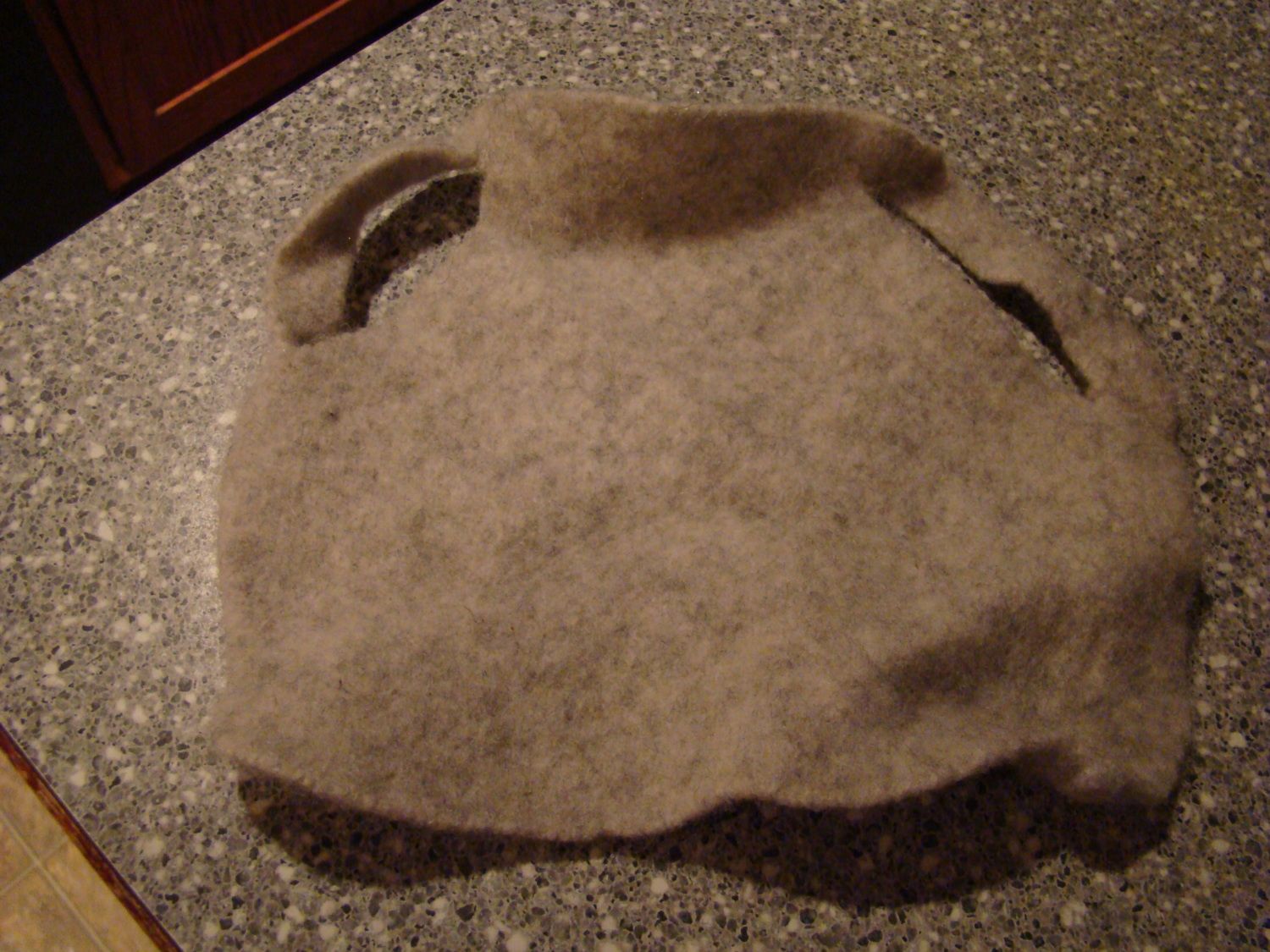 Lacy blues: Here is a photo of the hen saddle/sweater without a chicken in it. Keep in mind that its been washed and didn't dry flat unfortunately and so the little wing slits are kind of rolled and twisted up a bit. I just basically used the general shape of the pattern they used on the initial pages of this thread. and then cut 2 inch slots along the area where the wing would be situated leaving a 3/4 inch margin from the edges.
