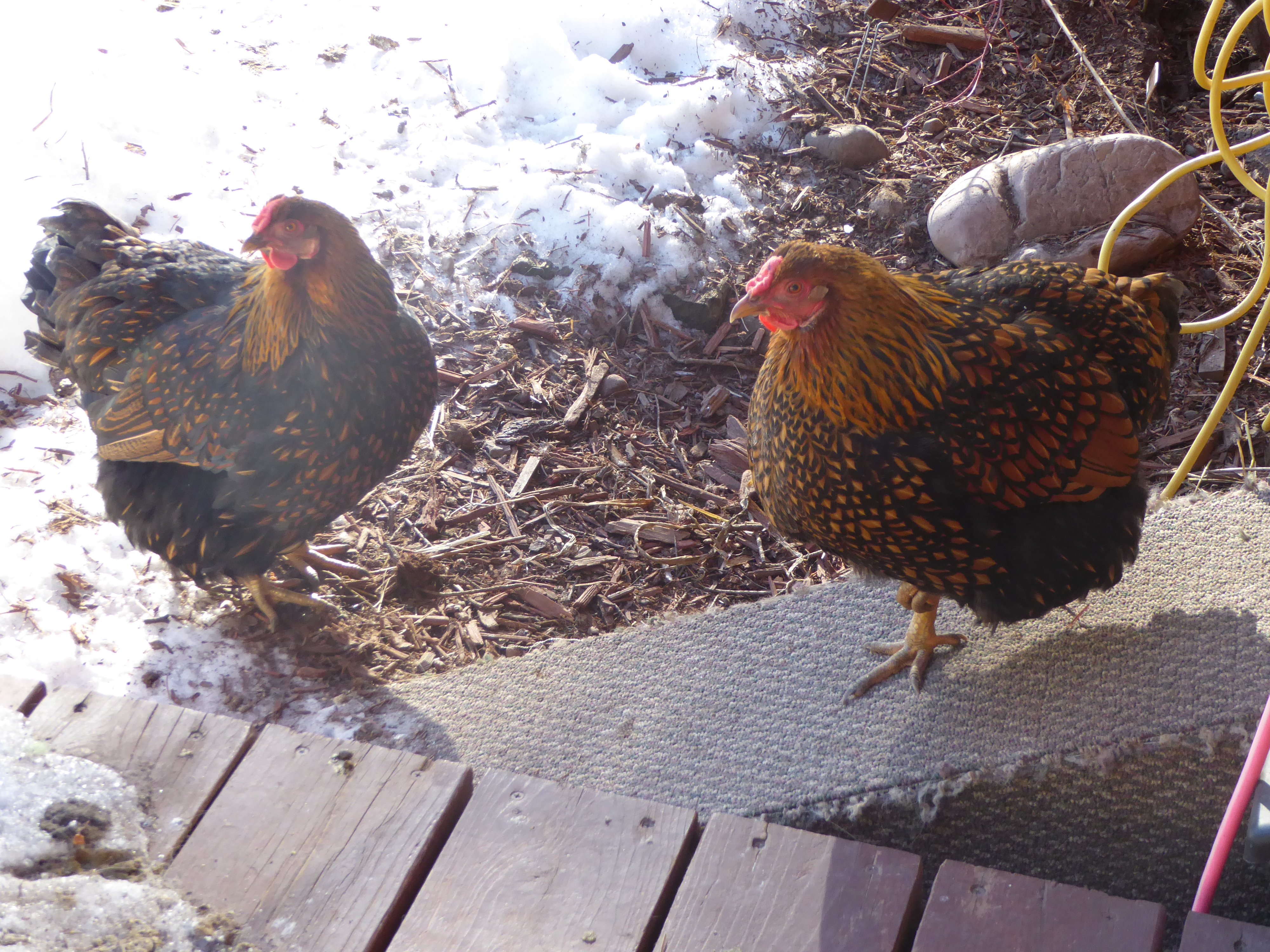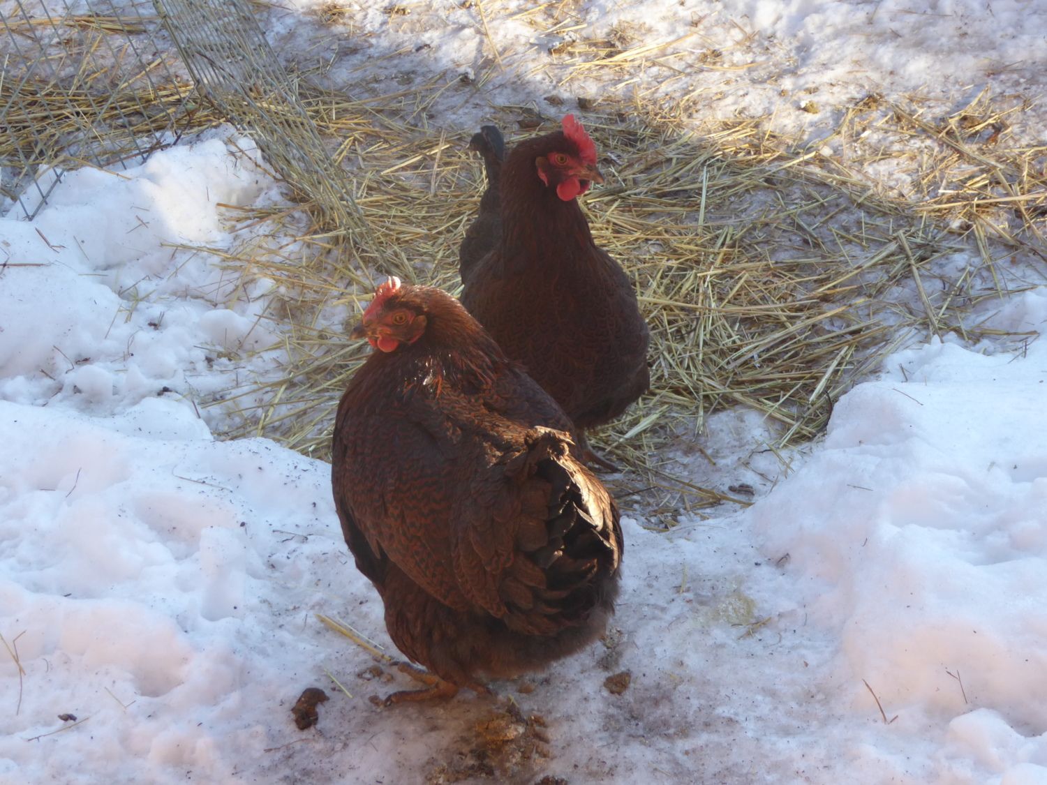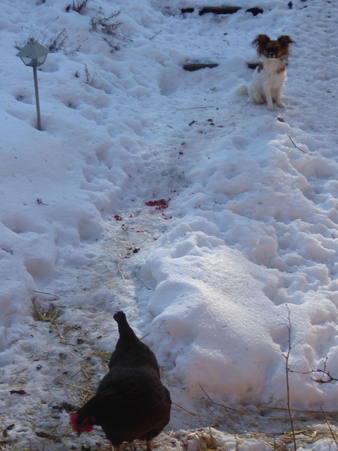 This is very timely. We have not had consistent snow cover this year and the girls are very grateful. They hate snow. In fact, I can see my poor leghorn's (Daisy) feet turn red when she is standing in snow. I usually let them out to free range in the afternoon. Just after I let them out on Monday, this happened: