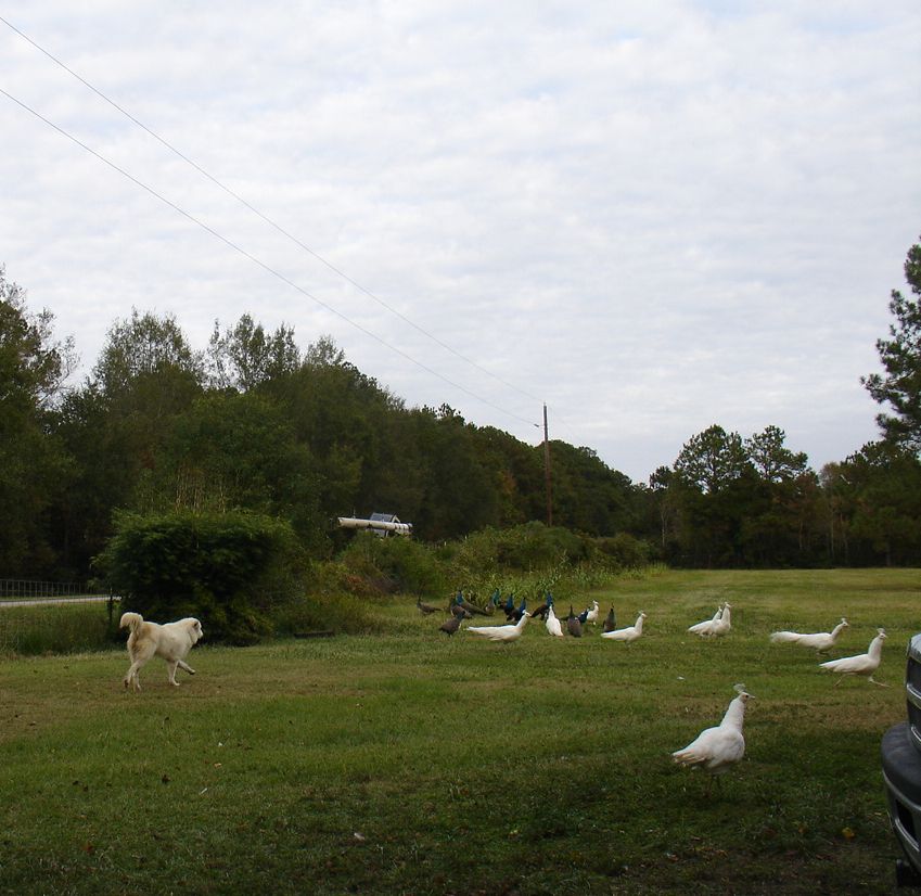 Peafowl can be trained to stay in an area but it takes alot of time spent with them, i teach a new bact i decide to keep every year, it takes about a year for me to get threw to their peabrain when working with young ones till they are around 18 months of age, until the age of around 6 months they stay close to the area they were raised , i am retired and have this kind of time, if you work or are away from home alot i could not tell you how long it would take you, but by the age of 18 months mine stay put on about the 25 acres i want them to stay in i have more land than this but have trained them to stay well within the boundaries so even if they see something that they think needs their attention they are still on my place.. I have no close neighbors and my place is surrounded by my own woods with patches of woods threw out it , i have dogs that will stay with them when they get out of the safe areas where i can not see them, also over time they have learned that if they see something and start honking either i or the dogs will come to see what has their attention it takes time to build this bond but It works very well here, i have owned peafowl for almost 7 years now and have never lost a one to roaming nor predators as they are shepherded by me and my guardians and we make round several times a day weather permitting ,............ i do not leave my place till around lunch time when all birds on my place come up for a siesta unless i absolutely have to , i have had to leave all my animals for days at a time when my husband was in the hospital multiple times out of town , i totally rely on my guardians to keep an eye on things and they do their job very well ;) I have distance neighbors that can not even keep a free ranged birds of any kind for 6 months without something taking them. i do see predators and catch images of predators on my trail cams but they do not even try to take a bird because my scent as well as the dogs is all over this place and it is fresh so they keep their distance or pay the consequences . We had geese drop in for a visit they got run off real fast Pups in training Watching the sky Pup learning to make rounds with the big guy Chillen on a hot summers day new babies The watcher Protecting the peas from the tree trimmers Digging deep for a fox that tried to come in She smells something Keeping a close eye on them at all times Making rounds with the peas