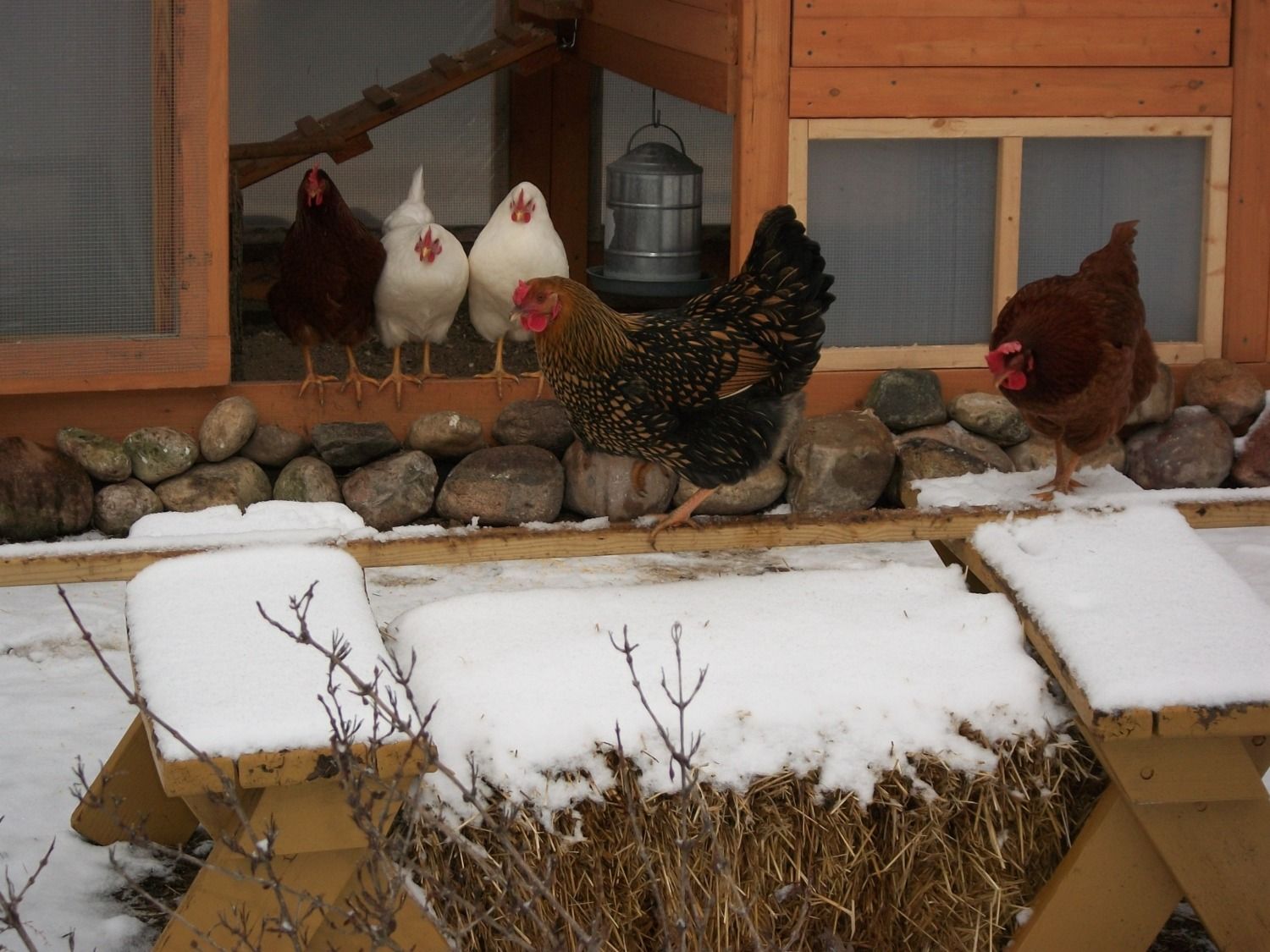 Our chicks who are not a year old yet hesitated with our 1st heavy frost here in MD. We have had no snow yet. We have a tarp on the roof, but plan on tarping the 2 sides to.