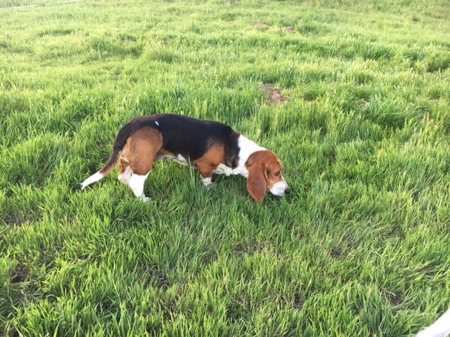 Here is one of my trusty "guard" hounds. If you see any bare patches in the pasture, it is surely from her or my other hound who enjoy nothing more than digging when they catch a gopher scent. Their presence does help keep ferrel cats, foxes etc out of the property.