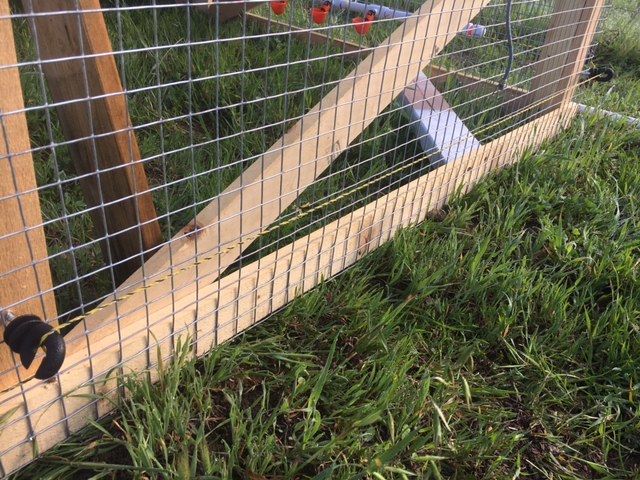 It's kind of hard to see but I ran a hot wire around the base of the pen too, tied into the electric netting. My theory here is that if anything made it past the net, which I have yet to experience with my other nets in operation, it would investigate around the base of the pen where it would come into contact with this hot wire and scare it off before digging etc.