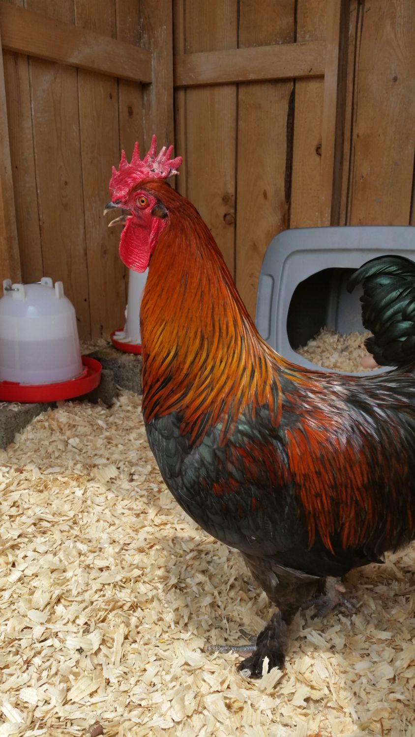 He has bright eyes, copper hackles, black chest, and feathers legs. He's also a bit of a maverick as his crow sound a little backwards. XD