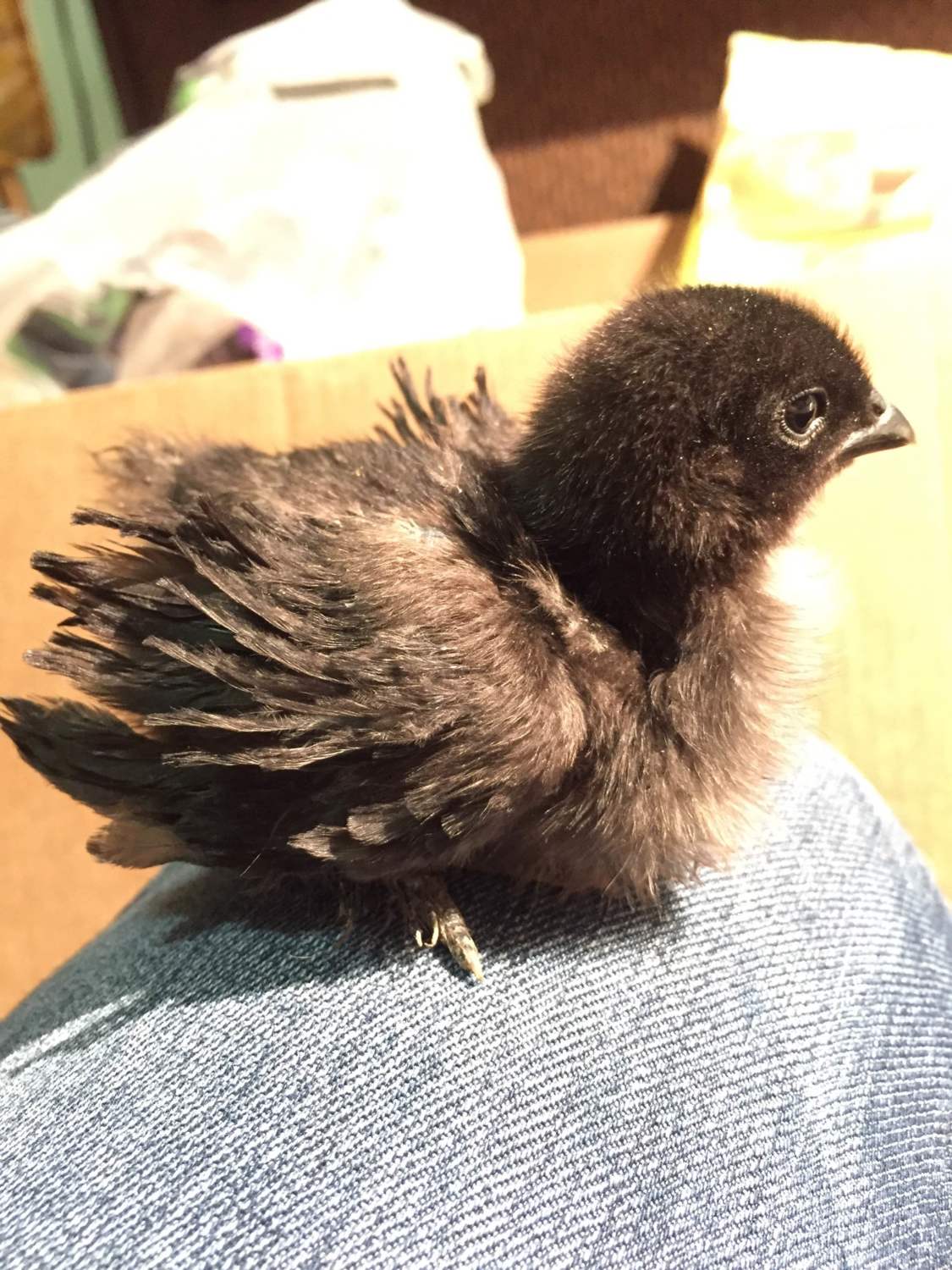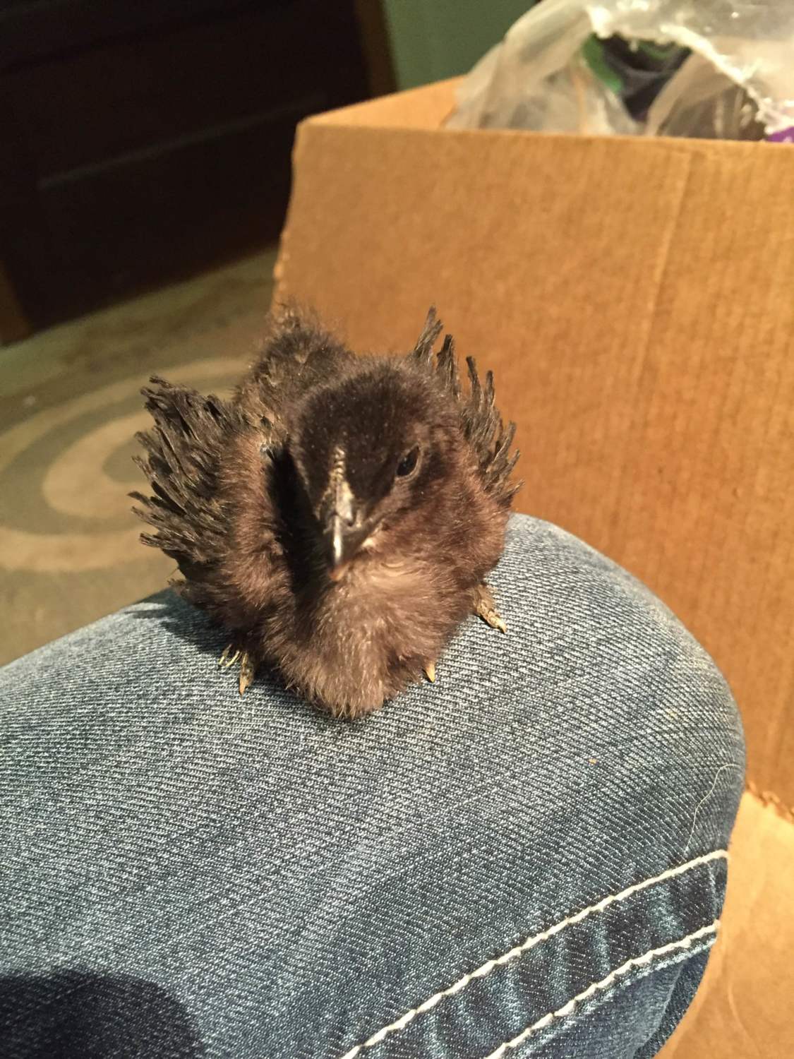 Yep, Armand's baby with one of the white silkies. I guess its still a frizzle, not a sizzle though... Looks more like the cochin than the silkie.