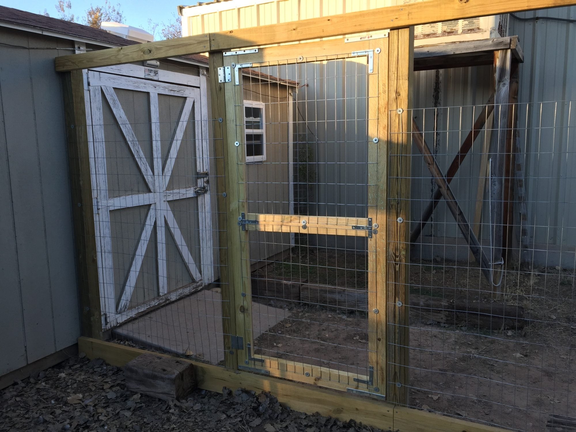 NO LAUGHING........... From outside the run: From inside the run: I had almost all of the stuff left over from when I built my coop in CA. Put magnets at the top and bottom so I can close it while I'm working. (Already had the magnets.) I'm going to scrounge some of the antique shops around here to find an old wrought iron handle for the front, then I need concrete stones for the walkway into the coop - both to prevent mud and keep anything from digging in..