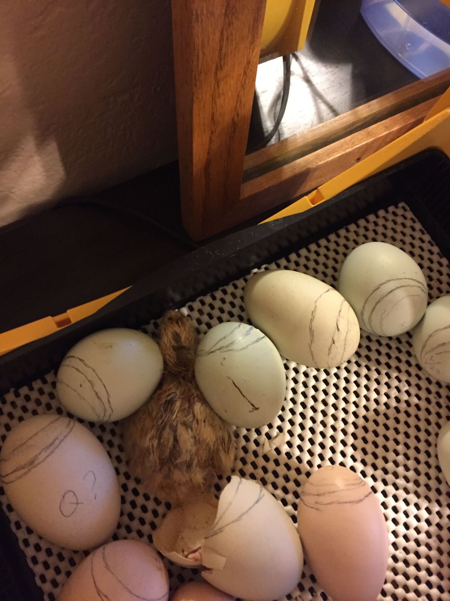 So DH stretches in the small bedroom with the incubator. I ask? Did you look in the incubator? NO. Did you hear any cheeping, NO. so I drink my coffe for a while and go check: