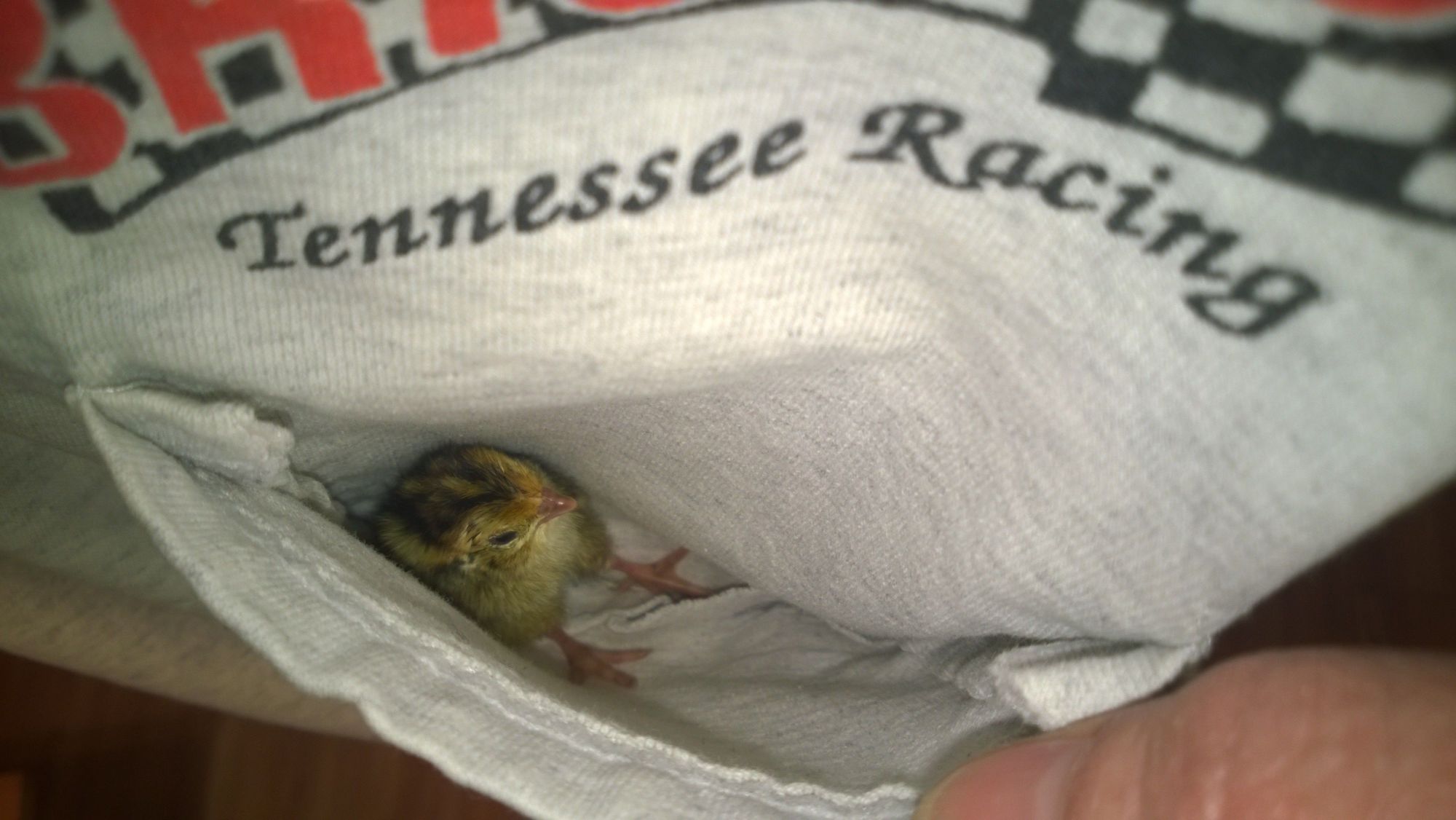 Alternative therapy for this one. Small case of splay leg, so its riding around in my breast pocket instead of taping its little legs together.