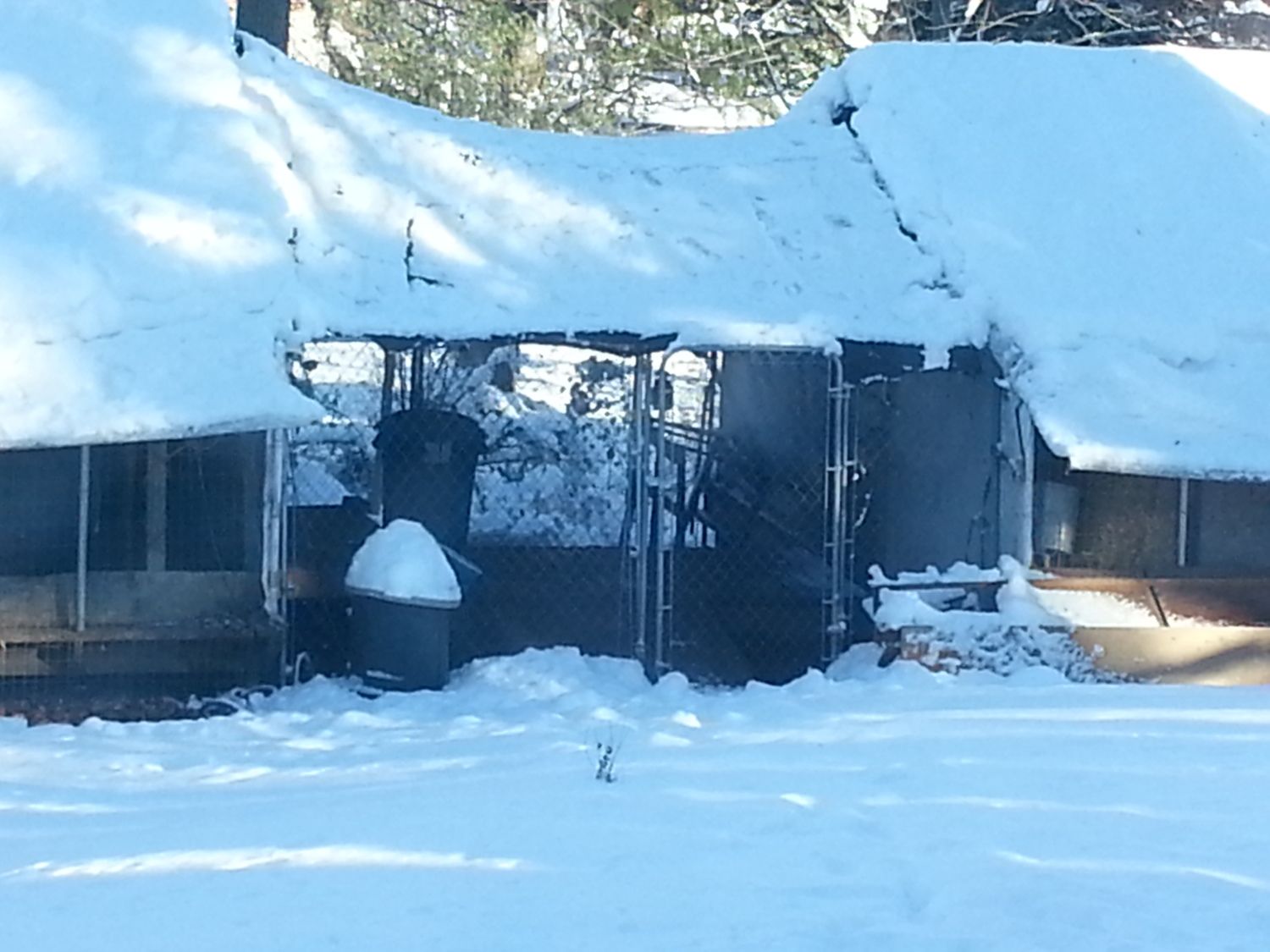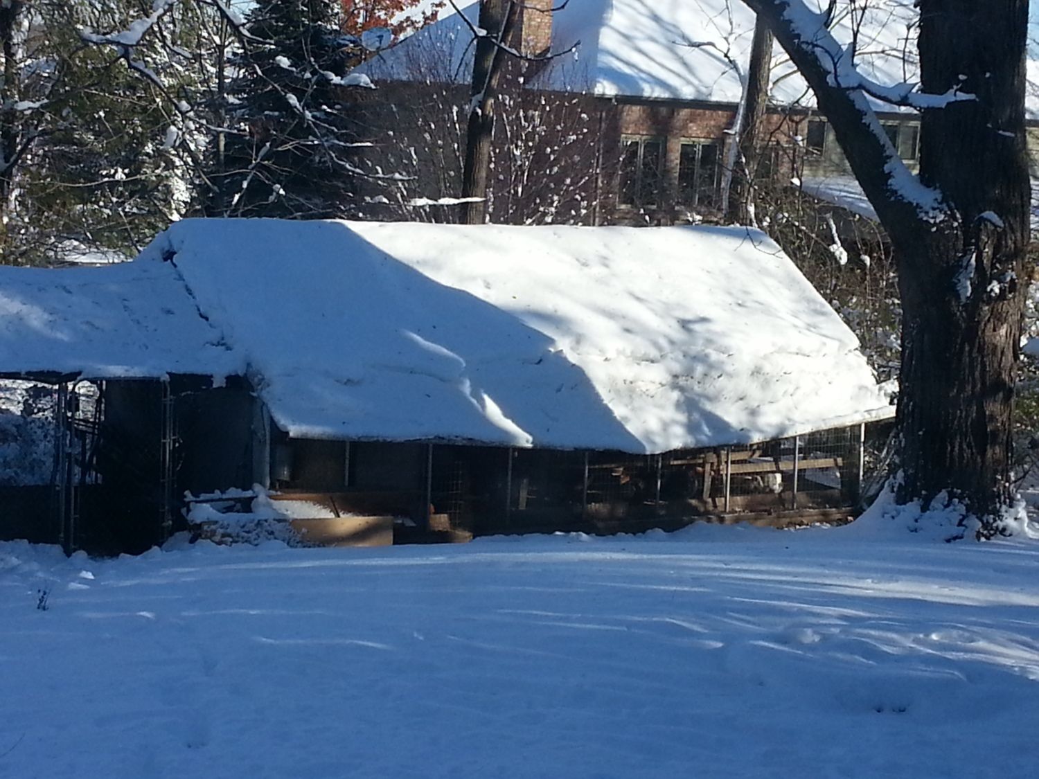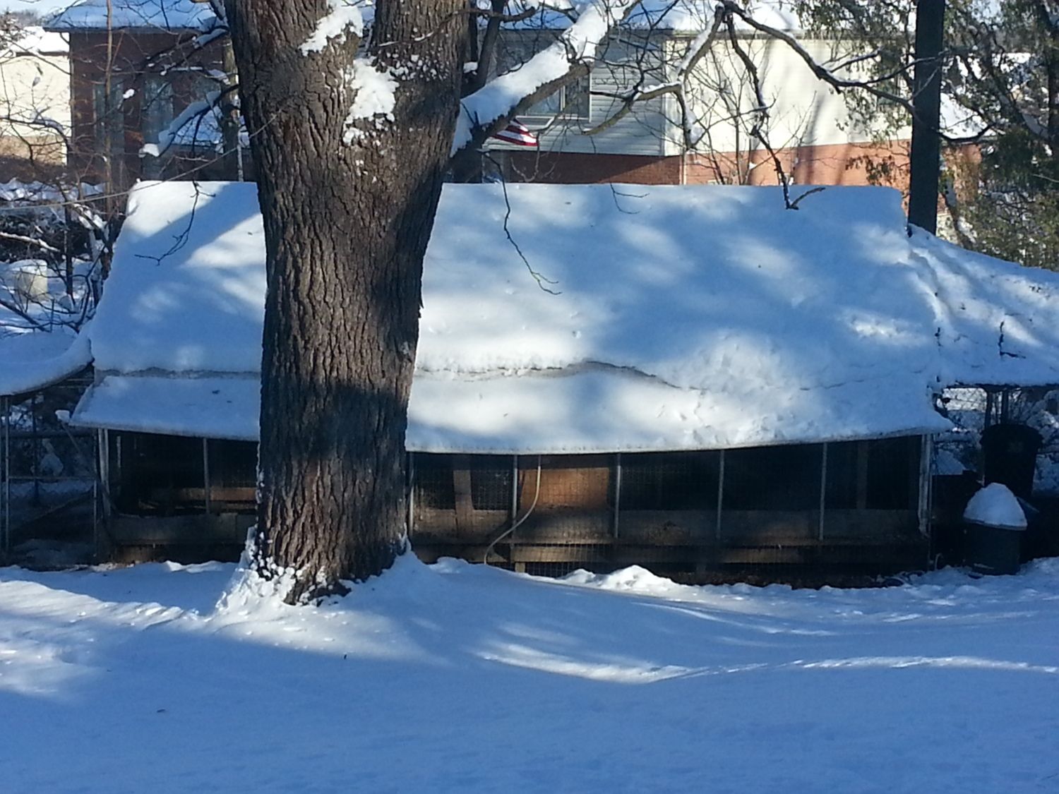 We have heavy duty shade cloth strung between the coops. It's an amazing product. That's 5" of snow on the cloth, 8" on the coops, which are fabric shelters from FarmTek. The run underneath is clear and dry.