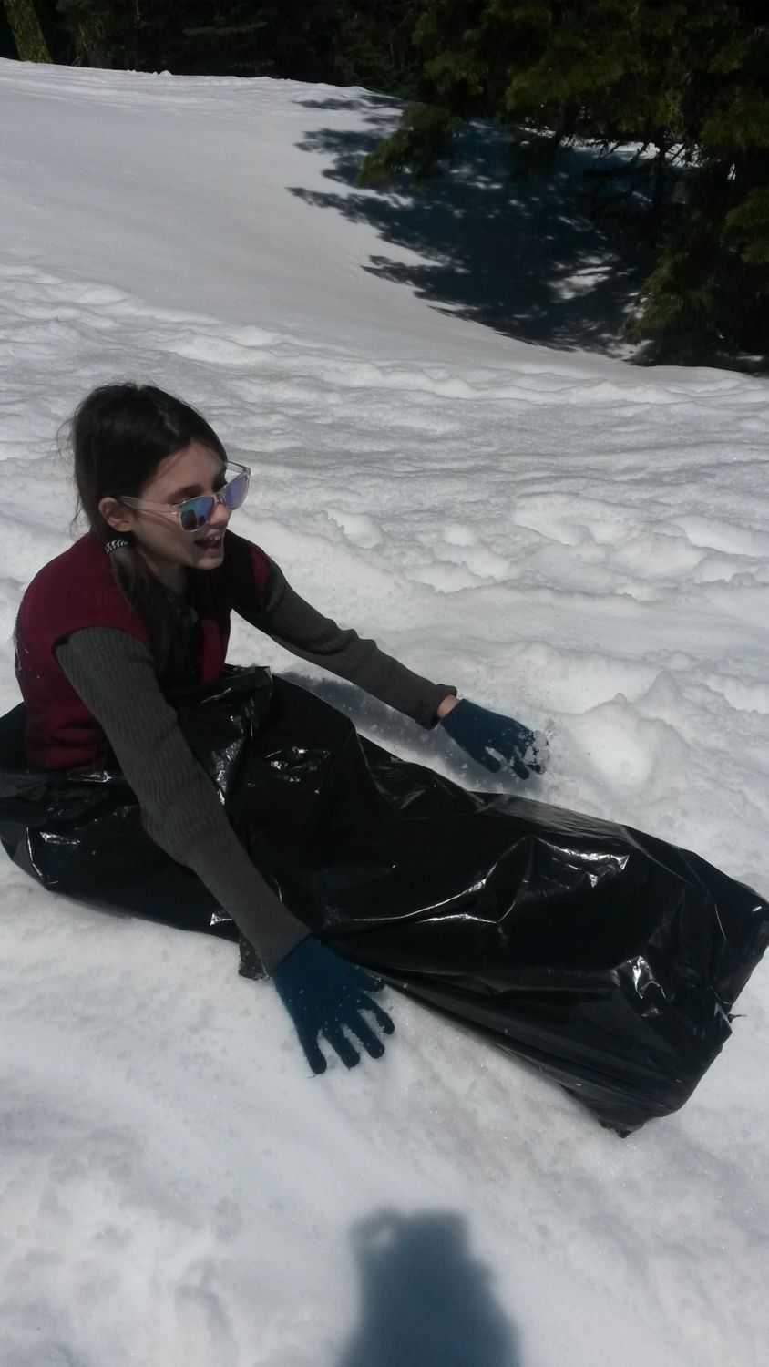 The original "sled" was cardboard inserted into a contractor bag, and that one worked better for Mr. P than inserting himself into the bag--he's just tall enough that the bag doesn't go to his waist... The nice, heavy bags lasted for quite a few runs.
