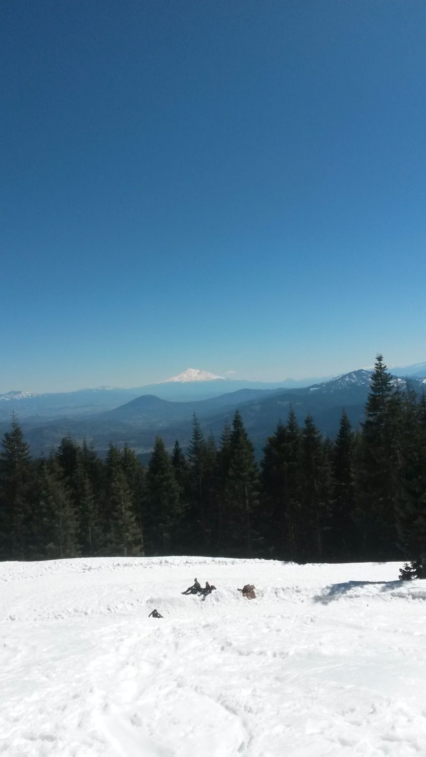 We were on Mt. Ashland, and the mountain in the distance is Mt. Shasta. Yes, we had coats with us--they're at the bottom of the hill, 'cause it was fairly warm--the coats were just one layer too many