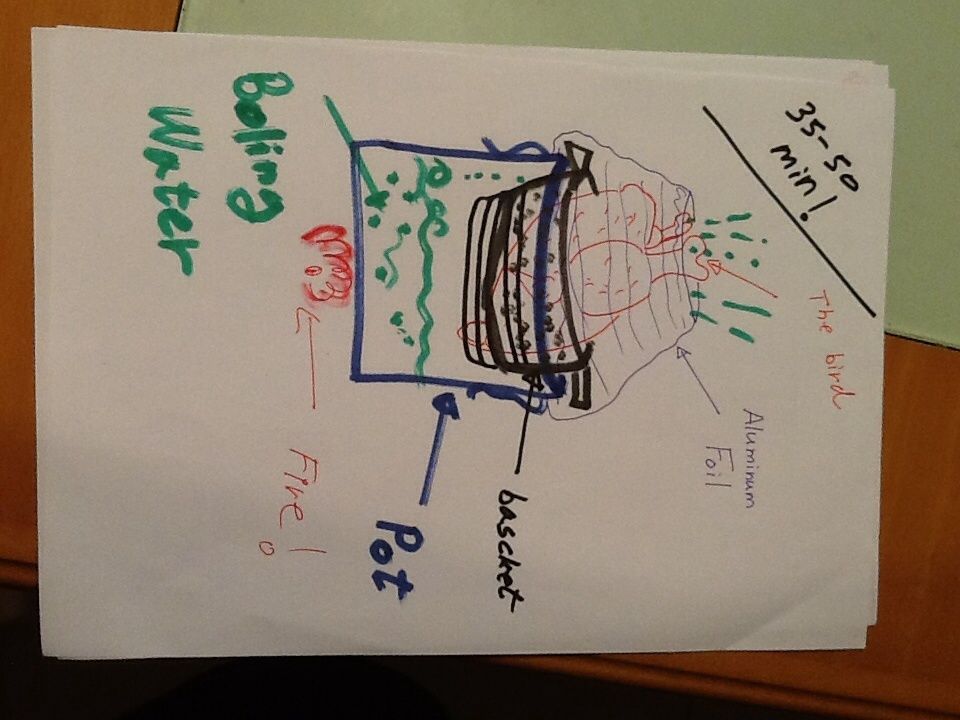 I know that a lot of you will go to grill a turkey very soon, I want to give you a culinary tip to make it much, much tender an tasty! You should steam it fir 30-50 min, before you put it in the oven! This draw show you how to build a steaming device from a pot, aluminum foil, and a basket pot!