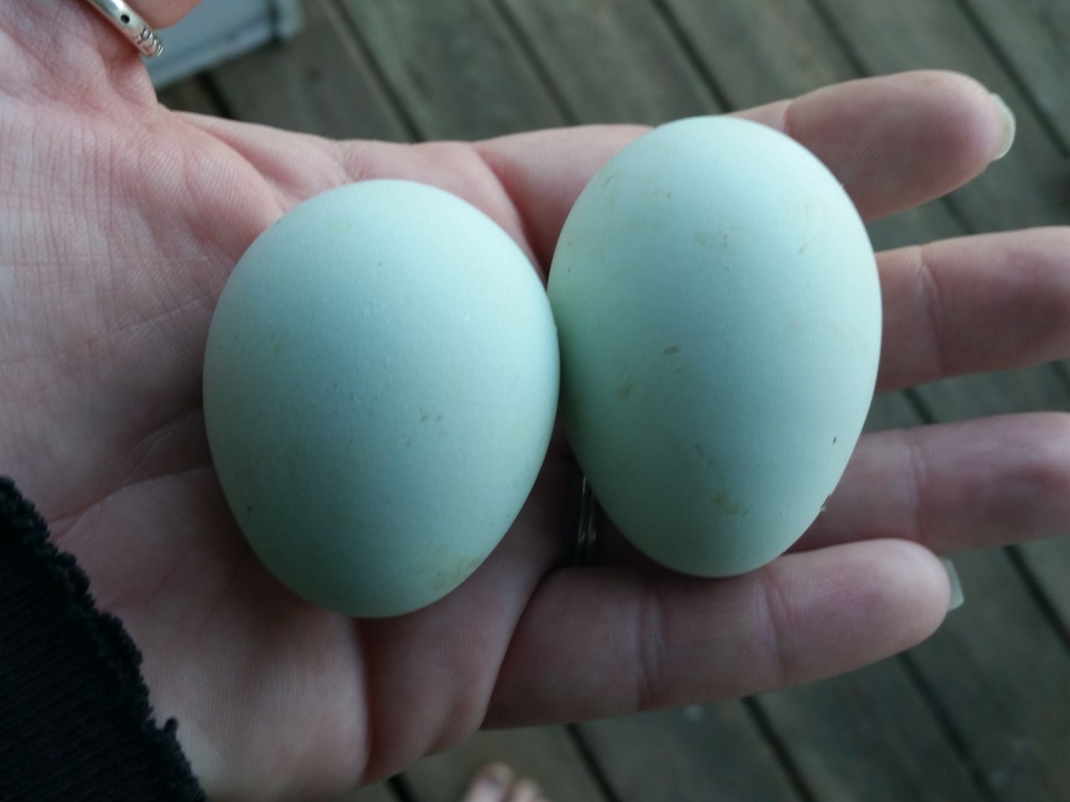 Left egg is definitely Araucana bantam, younger hen... but right egg doesn't look quite like the older hens eggs looked like... maybe the Am pullet is laying... ???
