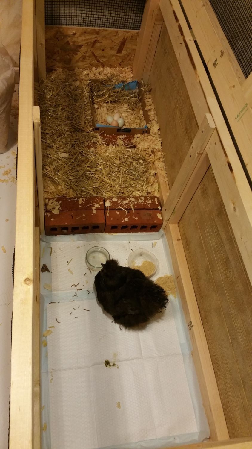 I have both of them inside. I have a temporary pen that I used last year as a brooder when I got in the hatchery chicks, but with two broodies, I wanted another area to use at first and then in case they have problems comingling. So, we built a 6' x 2' brooder. Only 2' tall, but it has a lid. I have Dahlia inside it now and Lily is in her box in the corner.