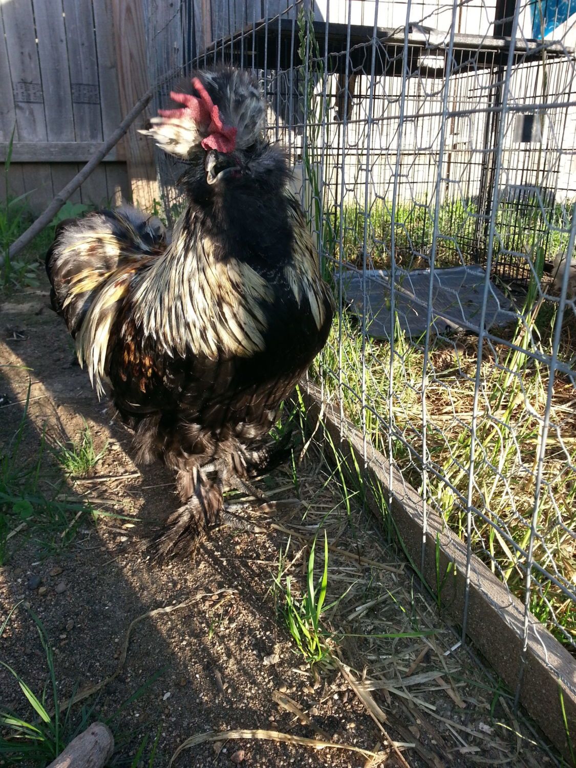 Frizzles are so hard to tell the sex of. I was sure Chickie (in my avitar) was a female for the longest time. He just looked way too cute with those curly feathers. He even started crowing when I got him a male companion who was crowing and I still thought, no way, "she" just doesnt want that roo to have anything on "her"> I finally had to admit that Chickie was a indeed a roo. Look for saddle feathers that hang down near the tail.