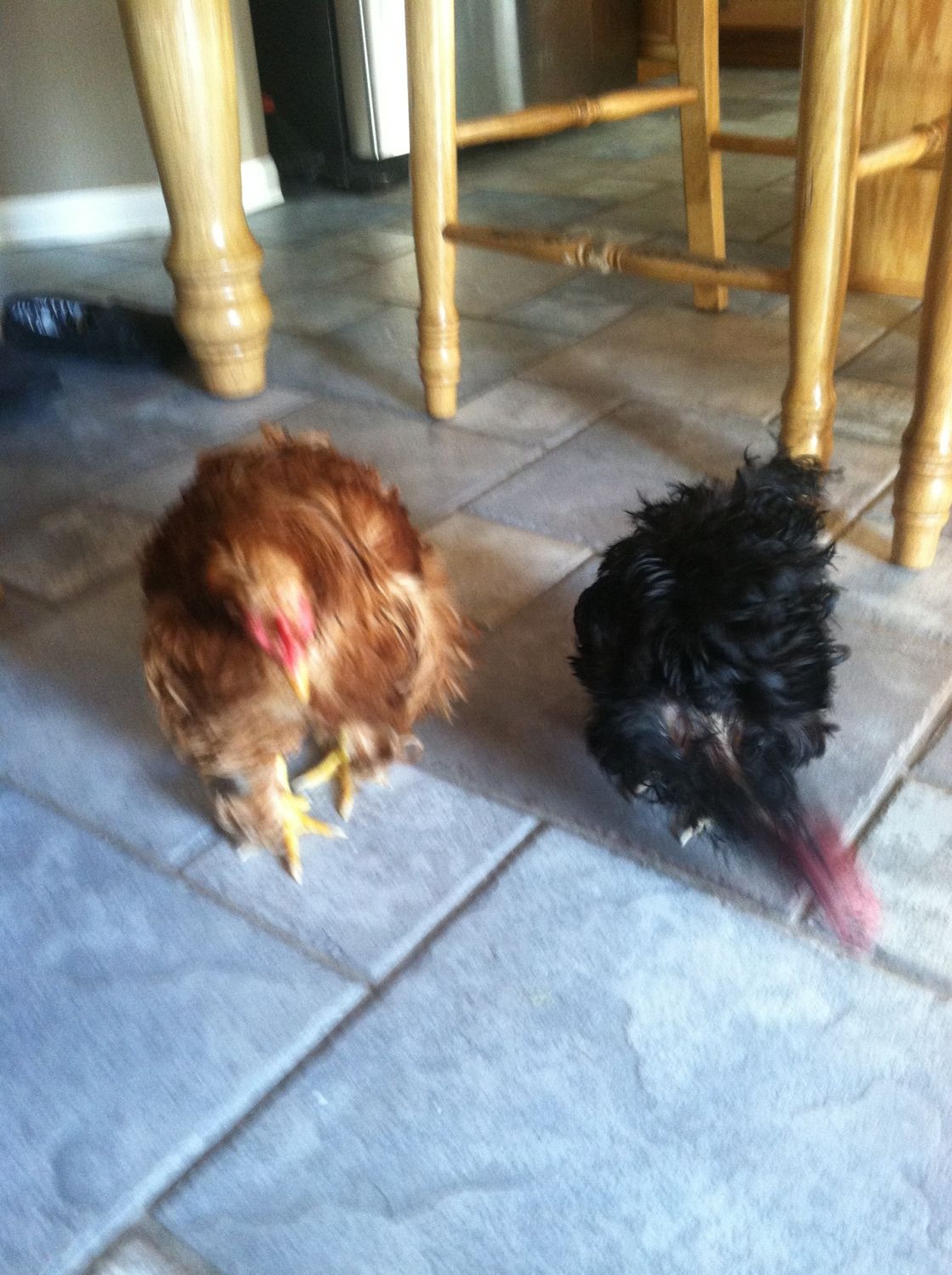 A little frizzle chick next to my muff faced chick. I think e black is a silkie Ameraucana mix. I'm not sure about the other. They both have feathered feet. My little Serema pullet has been mothering them.