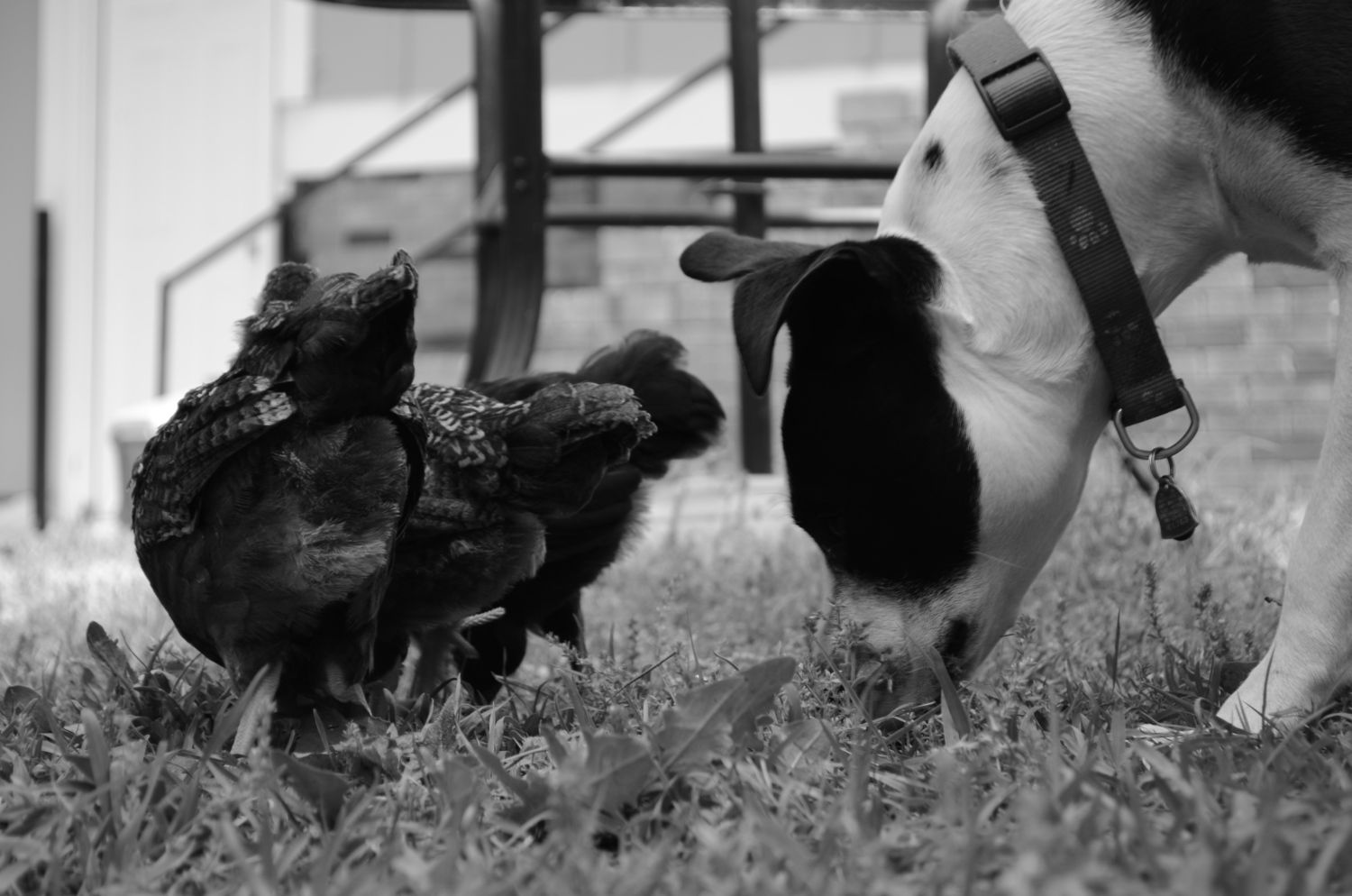 I have a little over a year-old Pitt mix named Patches. She has been raised around kids, cats and other dogs. I put a lot of time and money into training her and while she still has a lot of "puppy energy", she is eager to please and pretty well trained with the basics. About 8 months ago, we got our first chickens. We introduced them slowly and under close supervision. Things seemed to go well; Patches would gently sniff and nudge them with her nose. We even caught her bringing them her toys and treats, dropping items next to their tractor. When the cats would get too interested, she would stand between the cat and the chickens. We thought "Great! This is working out! Maybe we can free-range them once they get a little bigger." We even called the chickens her "babies" and encouraged the interactions they were having. Unfortunately, that misjudgment on our part proved to be fatal to two of our pullets. I had started to free-range them in our fenced in backyard, slowly decreasing supervision, but still with my doors and windows open so I could peek out at them frequently. They were doing great, even riding on the back of Patches.
