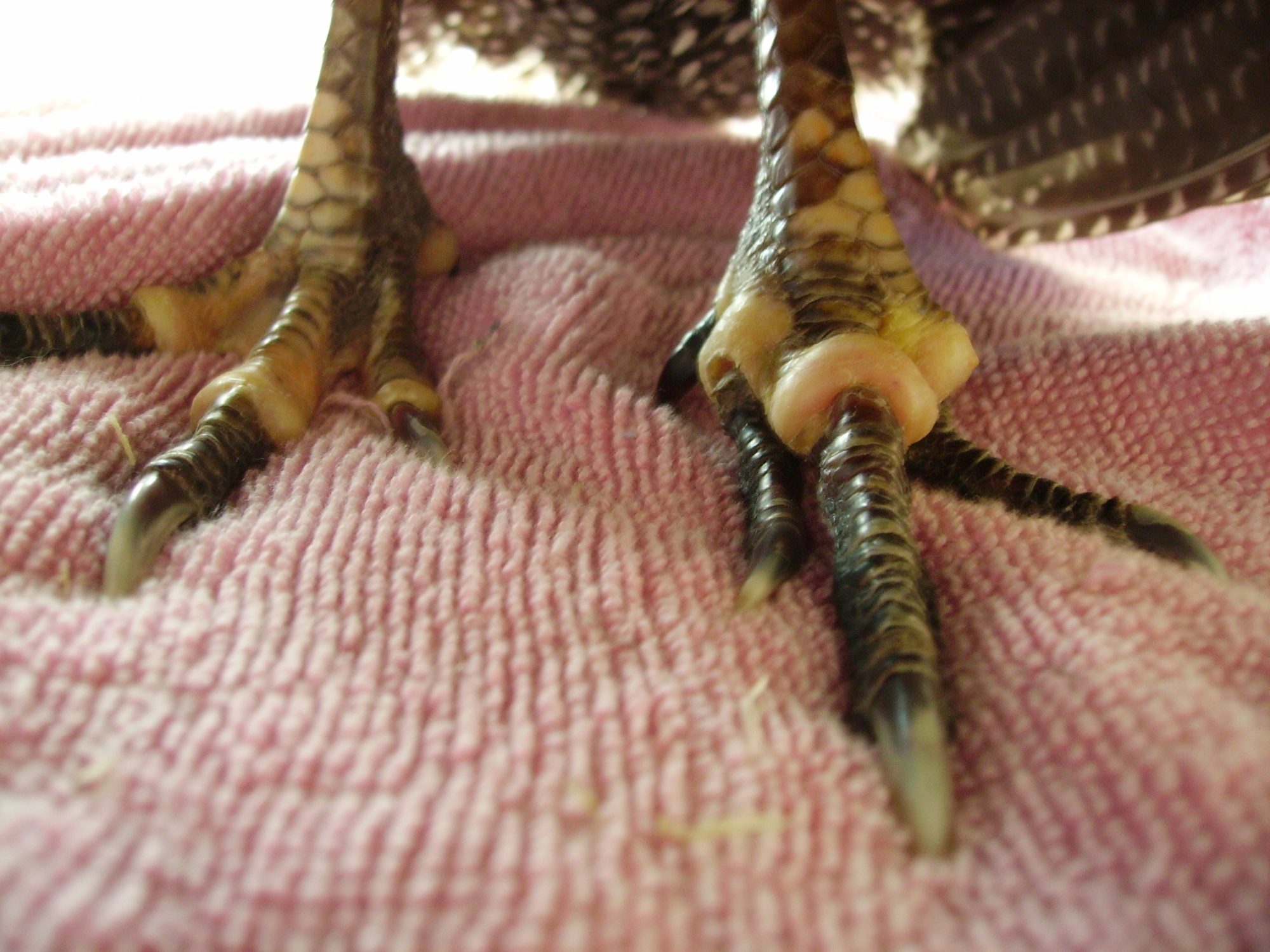 Thanks Eggcessive! Appreciate your insight. Will be patient and see what develops over the next week.I do think there looks to be some damge to her toes especially on the right foot on the middle toe. It is really hard to tell that much because of the grey color of the legs. Usually with white or yellow leg color, the necrotic area is easier seen. In most pictures I have seen, the dead tissue turns black and shrivels up in a week or two, and eventually falls off in a month or more. I would not worry about treating the possible bumblefoot now, but if you are seeing a vet, they might prescribe antibiotics for it. It may take a little longer to know how much of what toes she might lose. This very graphic picture shows the line where the dead tissue and the healthy tissue are: