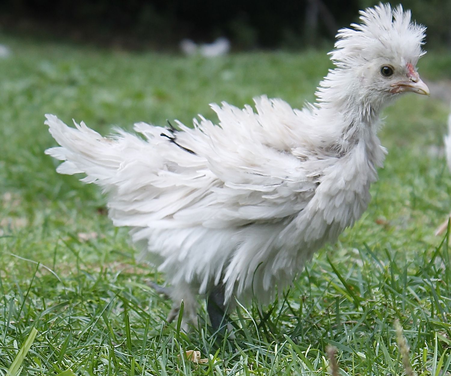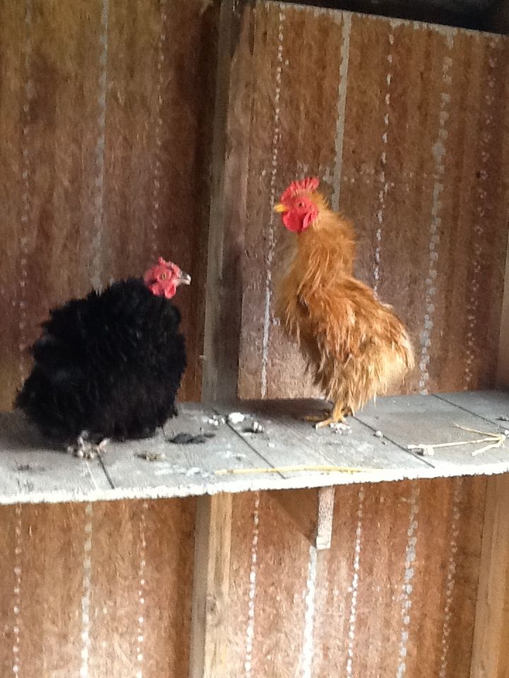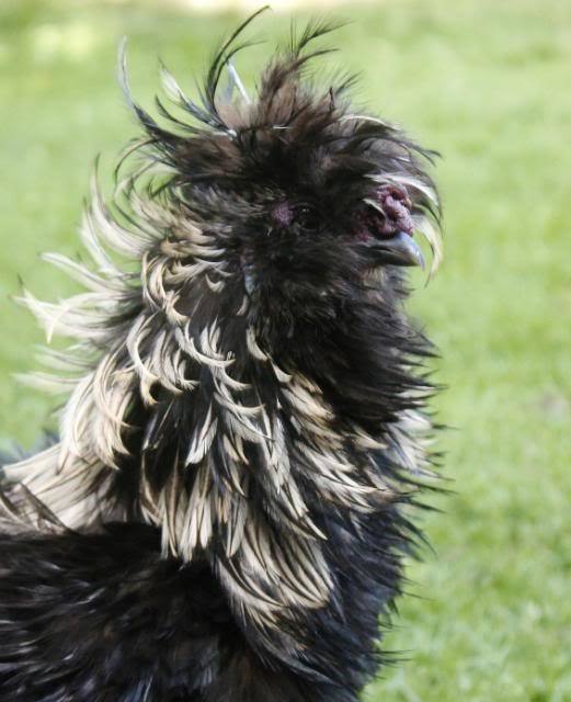 George is a sizzle. Has all silkie characteristics, but the feathers are rough frizzled. The other ones are George's kids crossed with a buff laced polish hen (other than the frizzled silkie, who is George's son but the mother was a silkie).