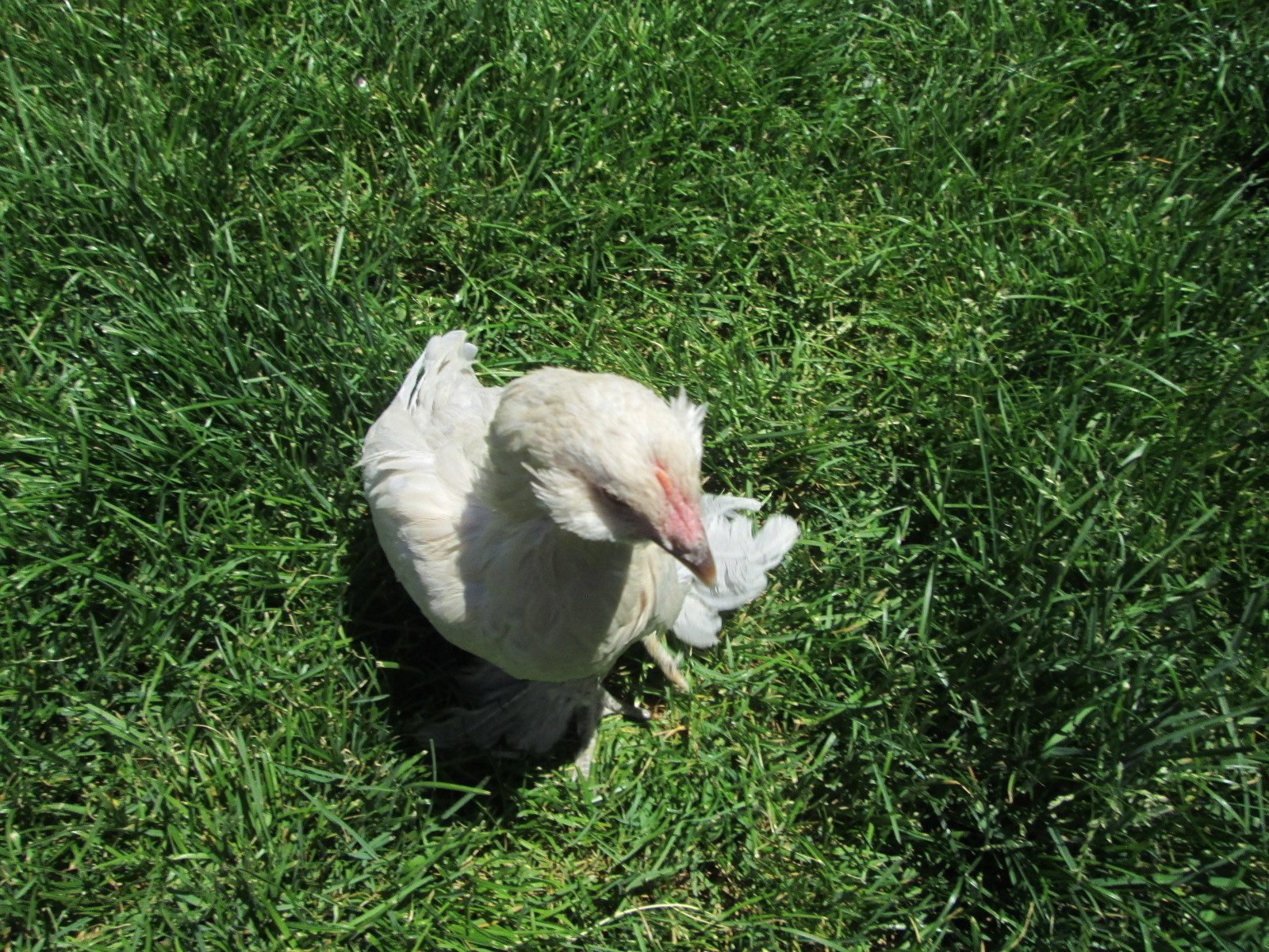 My cheap camera doesn't show her coloring very well. She has really pretty creme coloring, with light spots throughout. I call them spots..not real round though. What a sweet bird this is! My little bantam cochins are sweet as well..and also the Bielefelder. :)