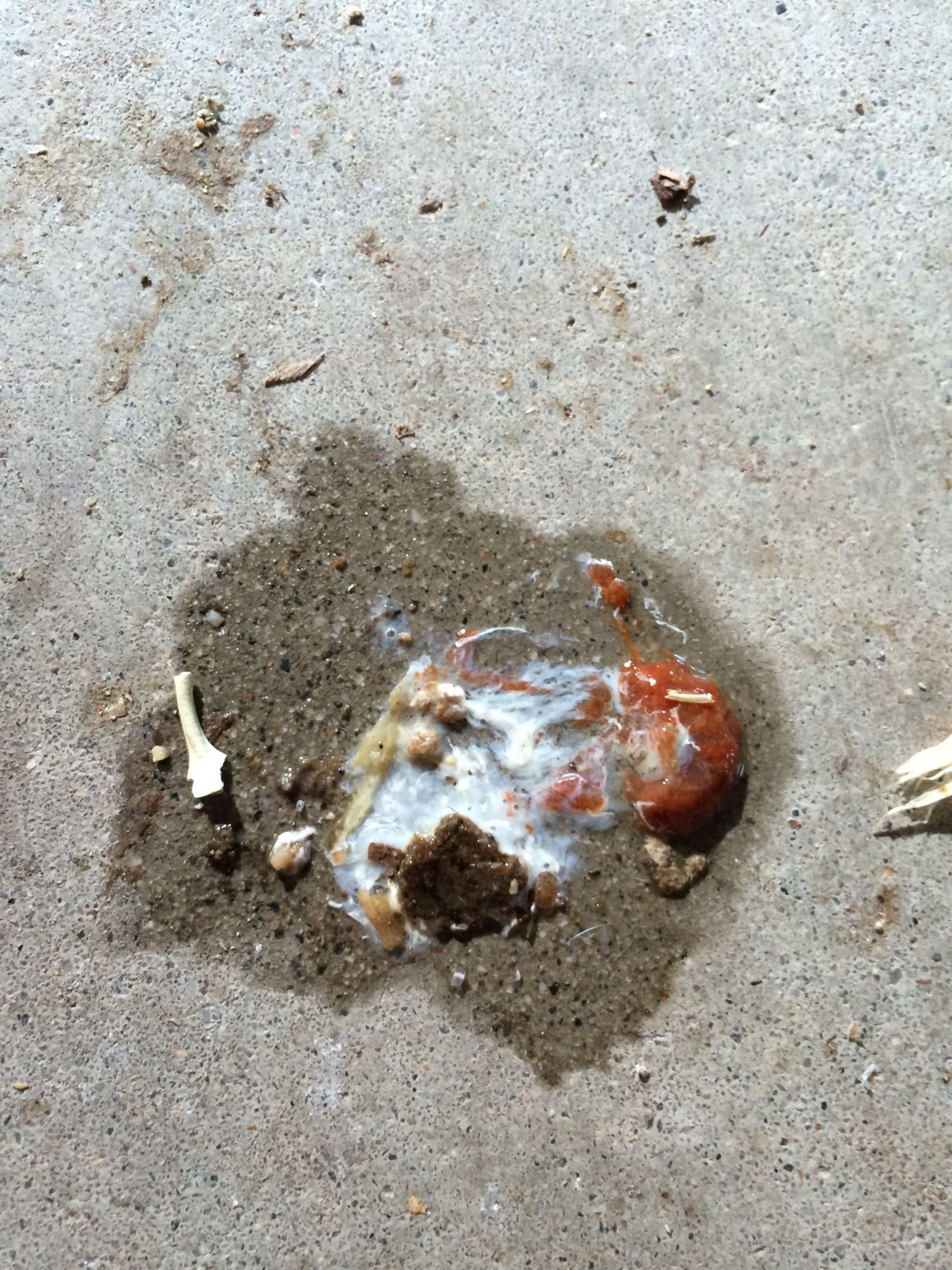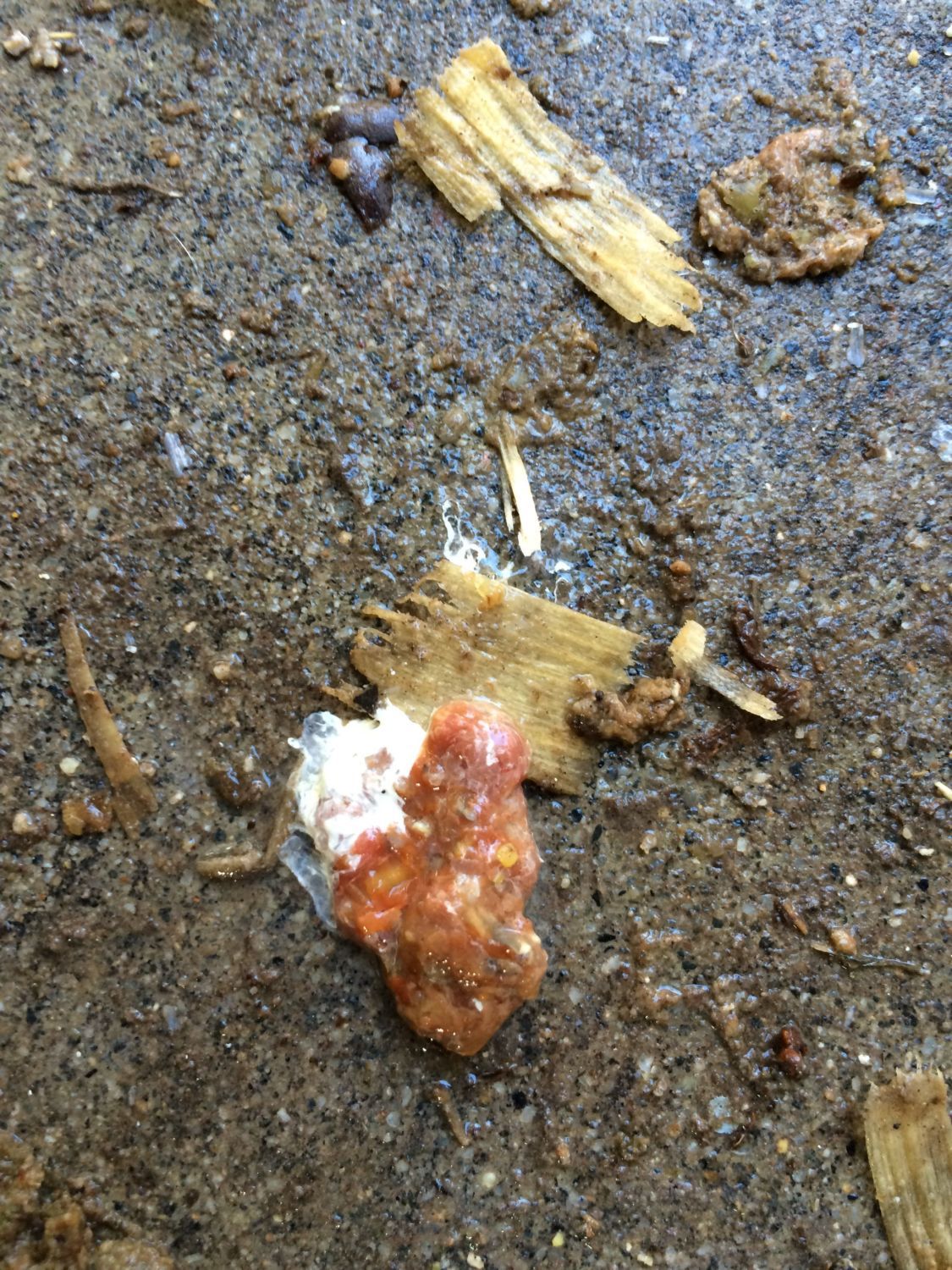 I've been finding this poop for a week now. Just one or two at first but these were all from this morning. The red seems like intestinal lining not blood, as its stringy not bloody. I started treating for worms. Is it worms or something else? Coci maybe?