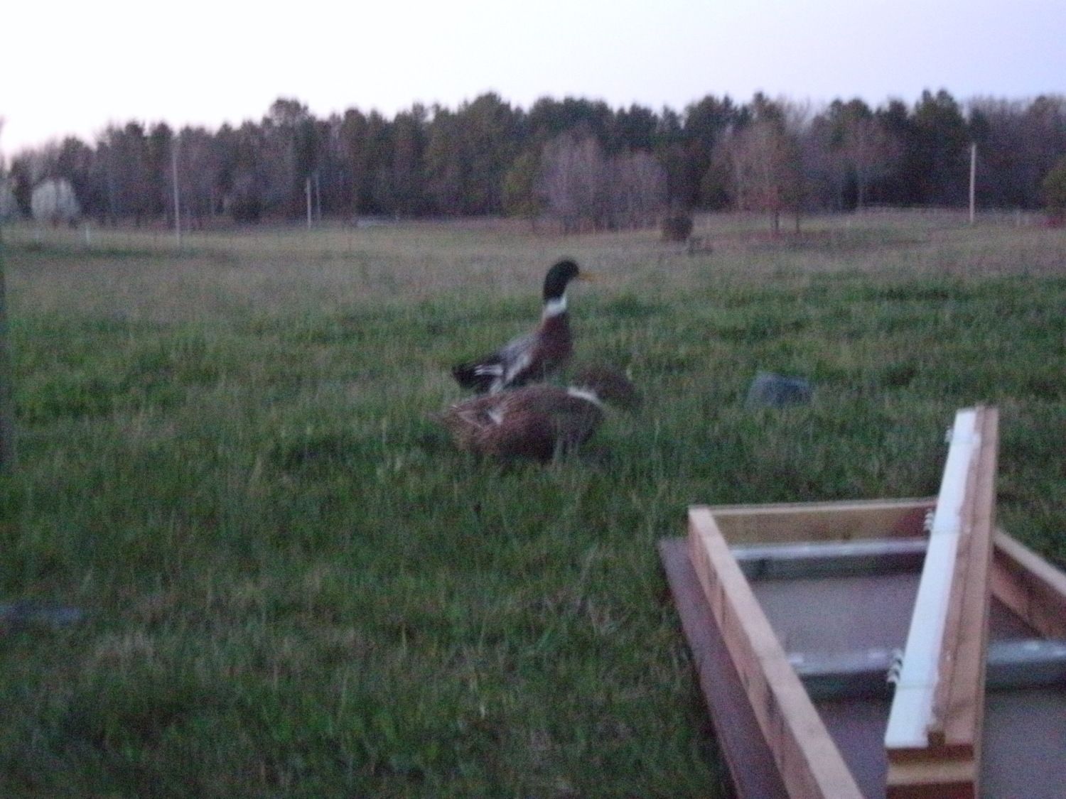 Okay so I've been mainly posting on the chicken side because I recently got 17 baby chicks (first time chicken owner). So today while we were replacing the walls on our old shed turned coop... Guess who waddled up to see what on earth all the banging was about? Two ducks. I think they are mallards but I do know that there was a pair. Male and female. My neighbors had a duck house and left for Arizona, leaving several people friendly ducks free to come and go as they please. So they moved into a different neighbors pond and made themselves at home for the past several weeks. I'm not sure if they were looking for handouts or were just curious. Either way, we fed them a little bread (I've heard its not the best thing for ducks but it's all we had on such short notice). The female ate from my hand but the male was a bit more cautious. My pics aren't great cause it was getting dark and I didn't want to scare them with the flash.
