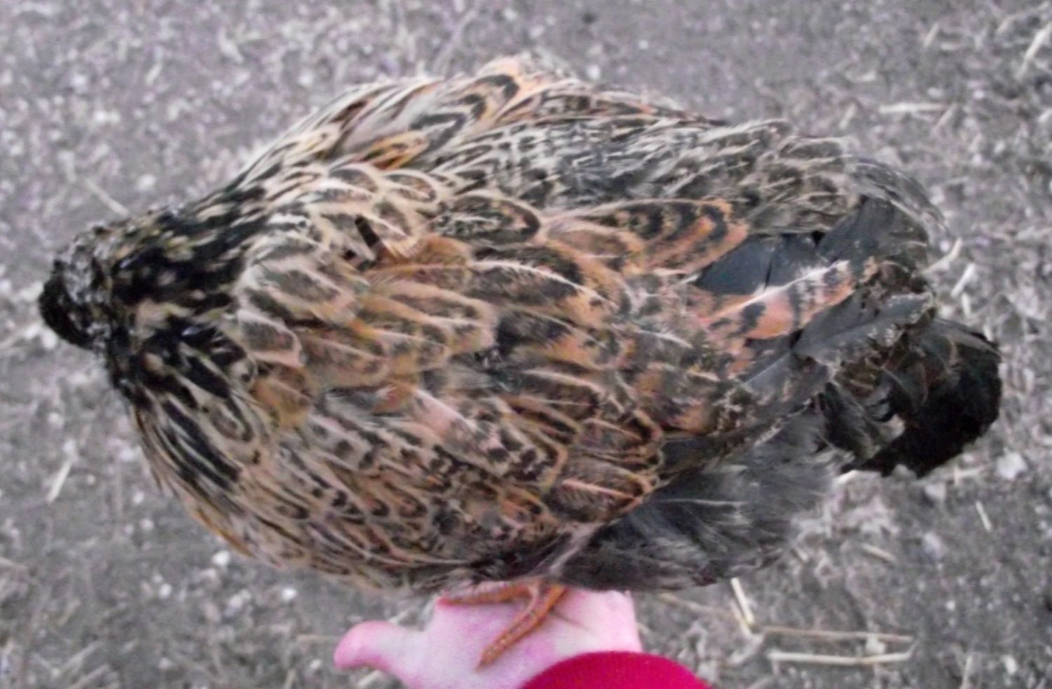 See? broad back, short body length from neck to tail; short thick neck feathering, short wings carried high on the body like a fly. Abnormally fluffy bottom, softer than the others, more silkie type underfuzz, sometimes the back feathers are barely there and it's mostly fuzz feathers? :