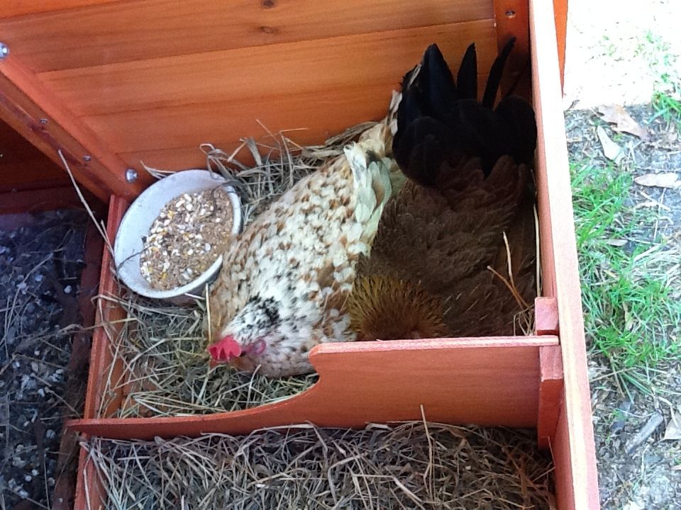 Garage Mamas...Here is what's funnier now. I picked up one of the chicks, the chick had a fit, and the moms were tripping over each other to be the first to the rescue. That was funny. The moms were separate today, one at one end of the brooder box coop thingy in the garage, and one at the other... The box is 2x4... And the chicks were running back and forth between the two. They'd get under one, then one would come out and run to the other, then back, and again. I thought I was going to pee myself. It was quite amusing. I am so glad I left them brooding together. Think its a great memory maker.