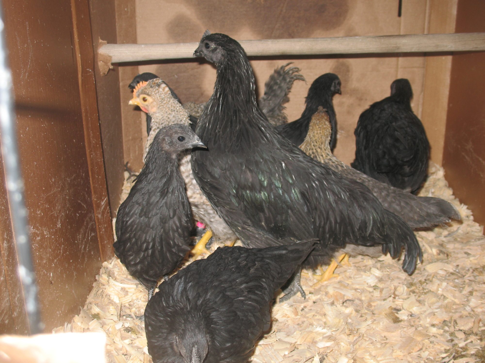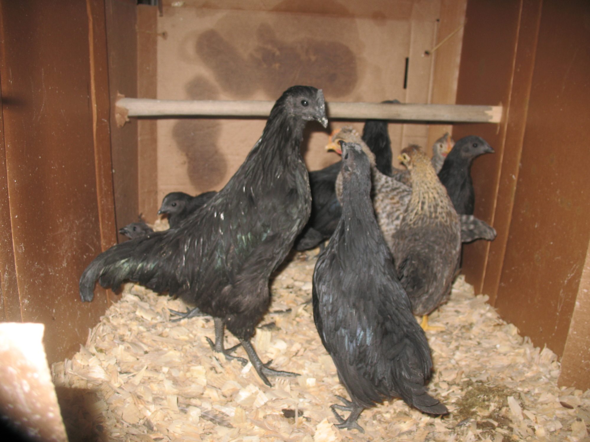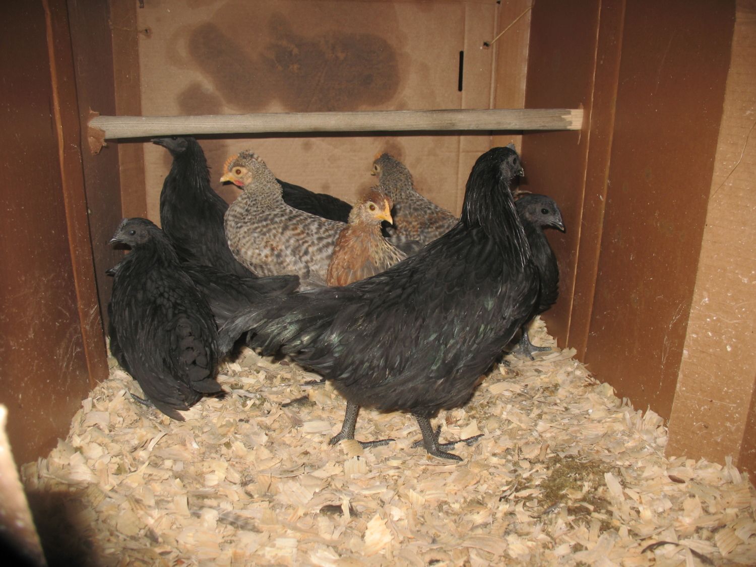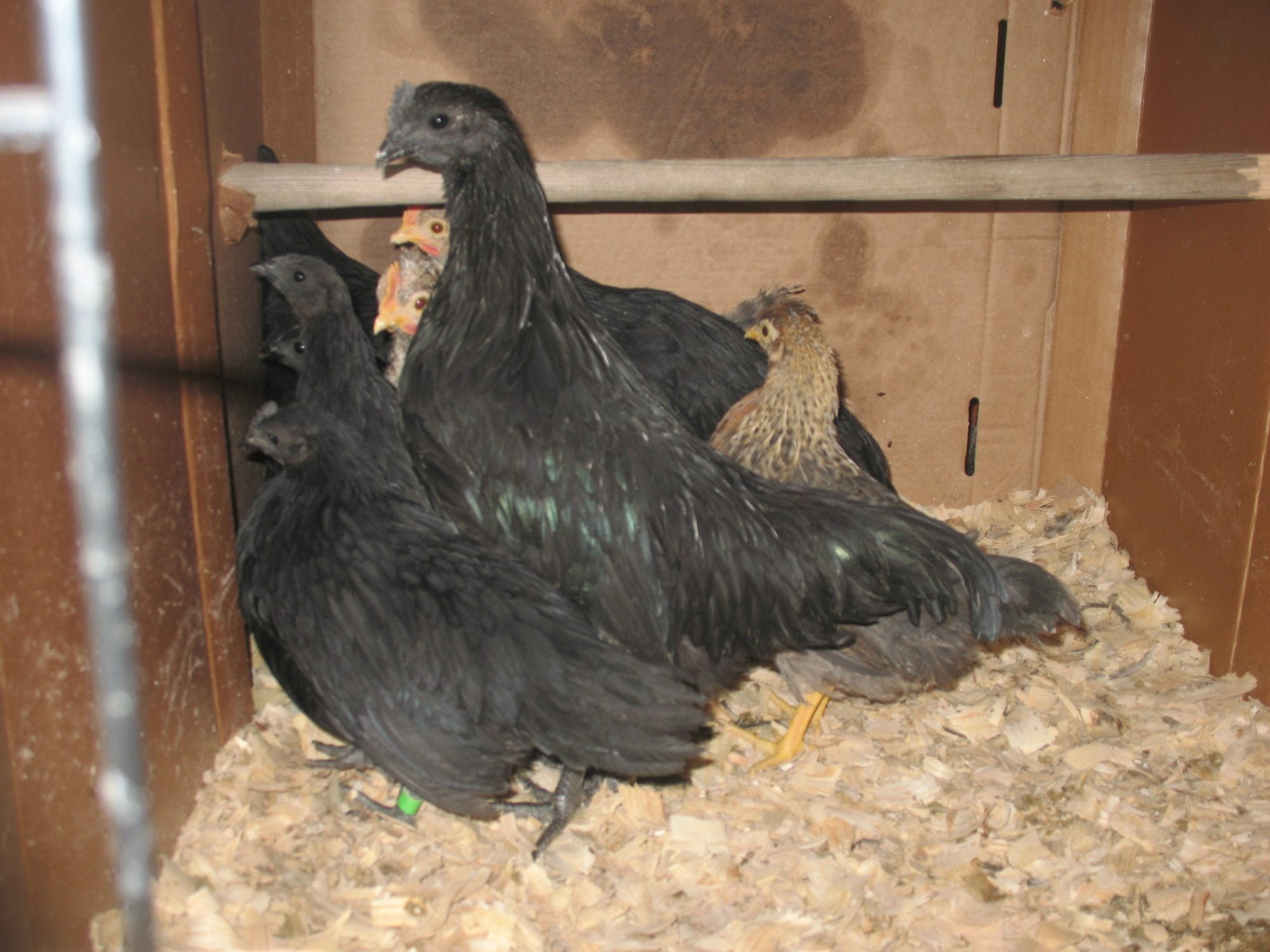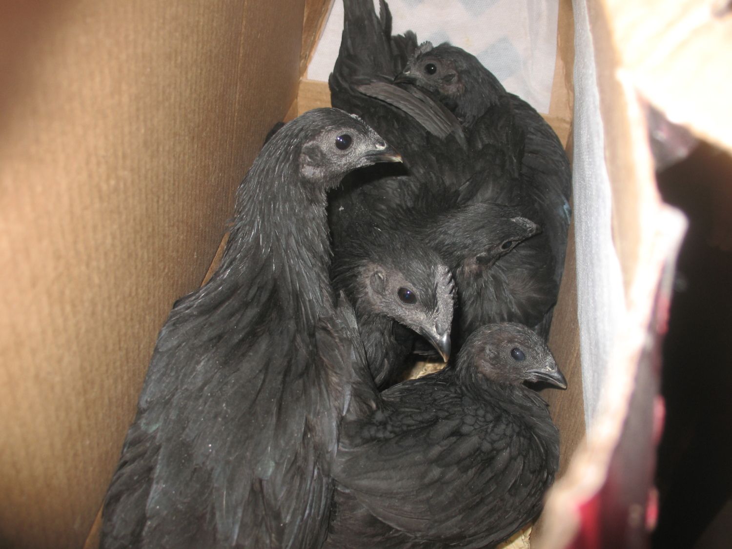 They were added to the brooder with the other babies (who range from 8-10 weeks). Don't worry, the brooder is much bigger than it looks. The bigger ayam cemani is Onyx, one that I hatched from CJ's flock before. He was making sure they all knew who was in charge but was still gentle :)