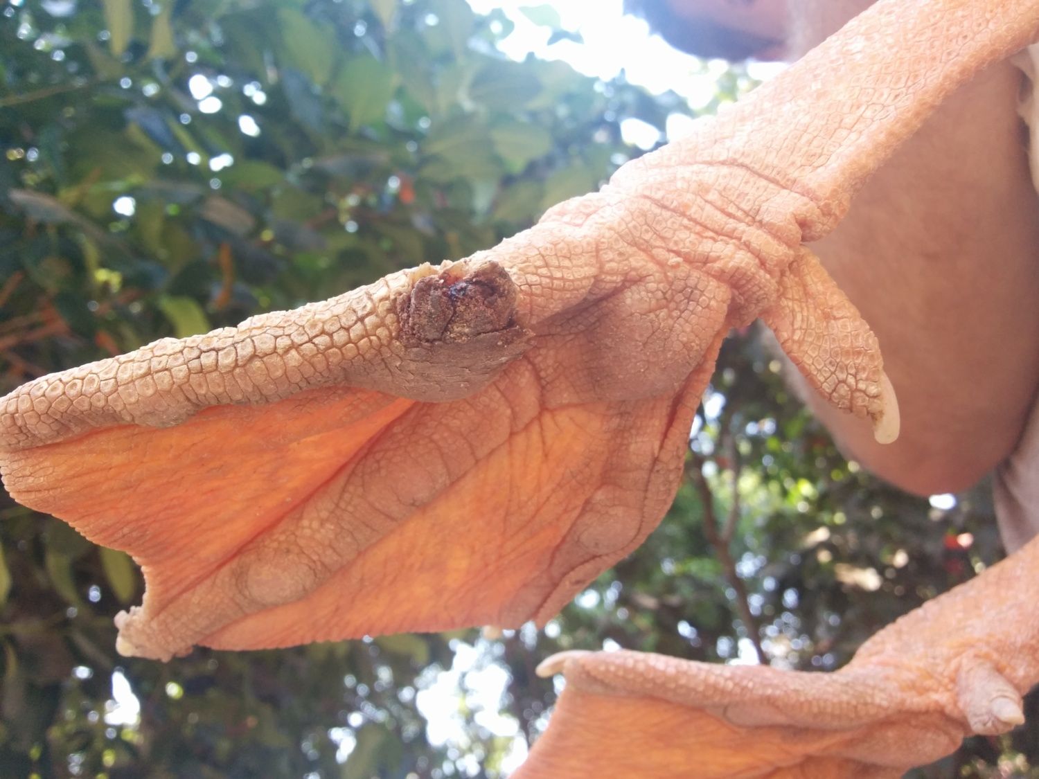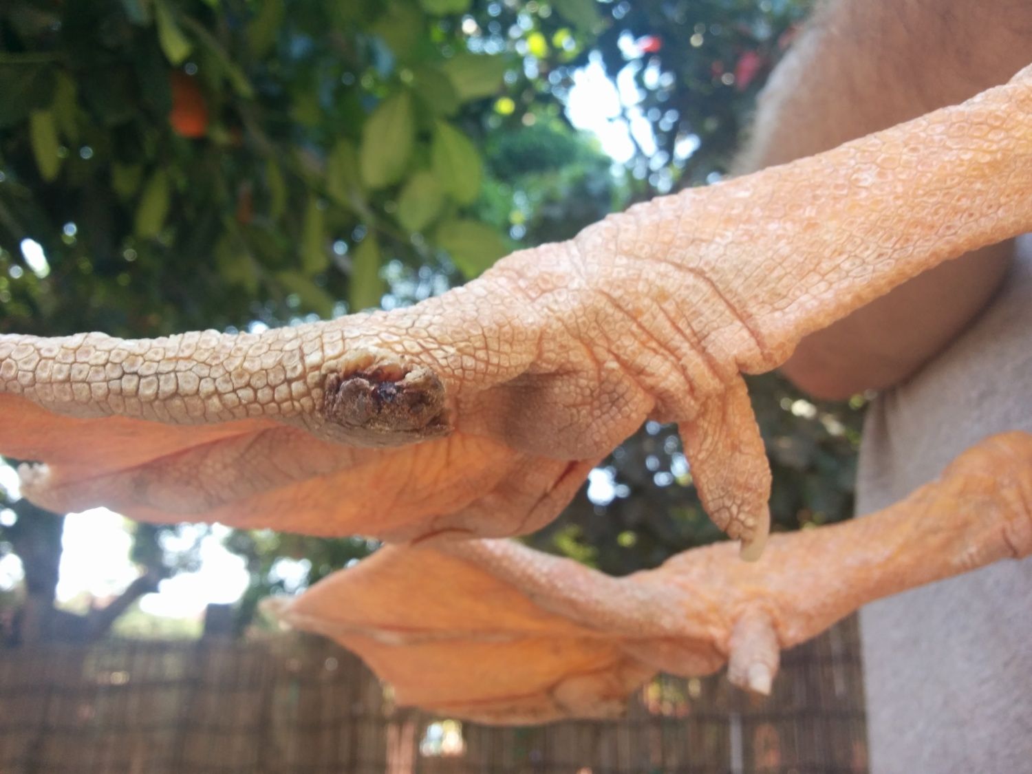 Bumble is infection and it will be pus in poultry, so once the scab comes off you most likely will see something that looks like thick cottage cheese just to illustrate it maybe yellow. that is what the bumble is you can use sterile tweezers and pull it out. I'll get you a link that gives pics. That will probably help.Thanks very much for the advice. We will start him on epsom soaks (they don't sell it in Cambodia but I brought some from abroad, luckily). When you say "get the bumble out" I am not sure if I understand. Is it just an infection is there an actual object I am trying to pull out?
