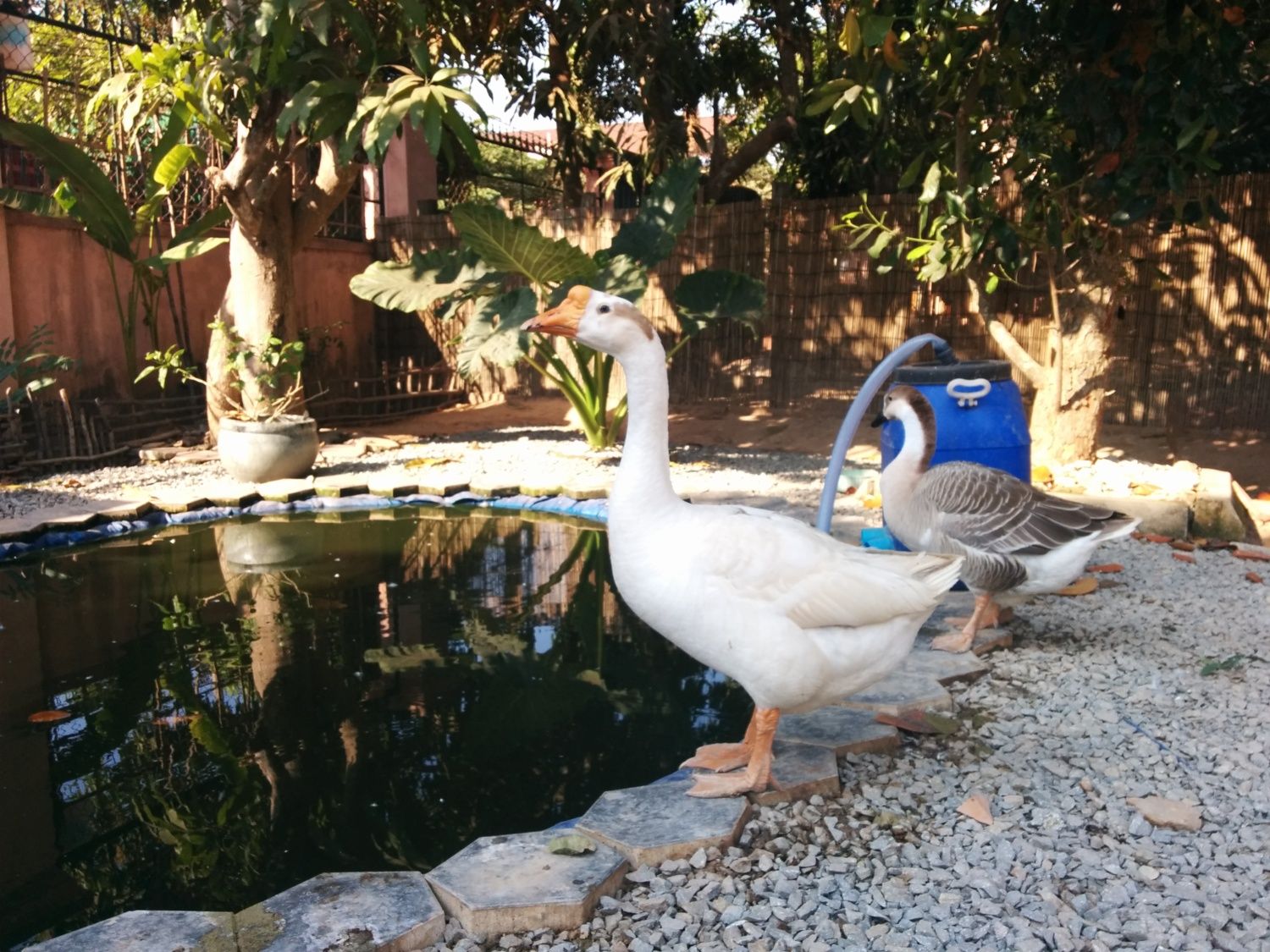 @lina500 they both are beautiful and look very healthy and no obese at all. I'm not sure why some poultry seem to be prone to bumble more than others, so far I haven't had a single waterfowl with bumble and believe me we live in very rocky terrain living in the mountains plus I have river rock all over to keep the mud down. The only poultry I have had with bumble is 3 chicken hens,. I treated all 3 at separate times with the ES soaks and colorless iodine and was able to get the bumble cleared up Main thing is to treat aggressively so the staph doesn't spread to joints . lina I have had to soak some geese feet before though for other injuries so what I do is take a gallon bucket put the ES in and nice warm water 1 cup to 1 gal of warm water mix to dissolve then put both feet and legs of the goose down into the bucket and hold to him. So far once they are standing in the bucket they don't try and get out, try for at least 5 mins but if he really is freaking out try for as close as you can get to 5 min .main thing is to get the bumble to the point where the scab comes off easily [it may take quiet a few soaks and iodine before you can easily remove the scabs] you can get the bumble out which with poultry pus isn't runny it is more the consistency of cottage cheese so you will have to pull it out with sterile tweezers. Then you soak again with the ES and dry and pack with antibiotic ointment. you can try putting a wrap on his foot to keep it clean while the hole fills in. but he should stay out of water till healed. The reason for colorless iodine instead of the reg is the ammonia in the colorless seems to draw the bumble to the surface.No for a Chinese he isn't obese.