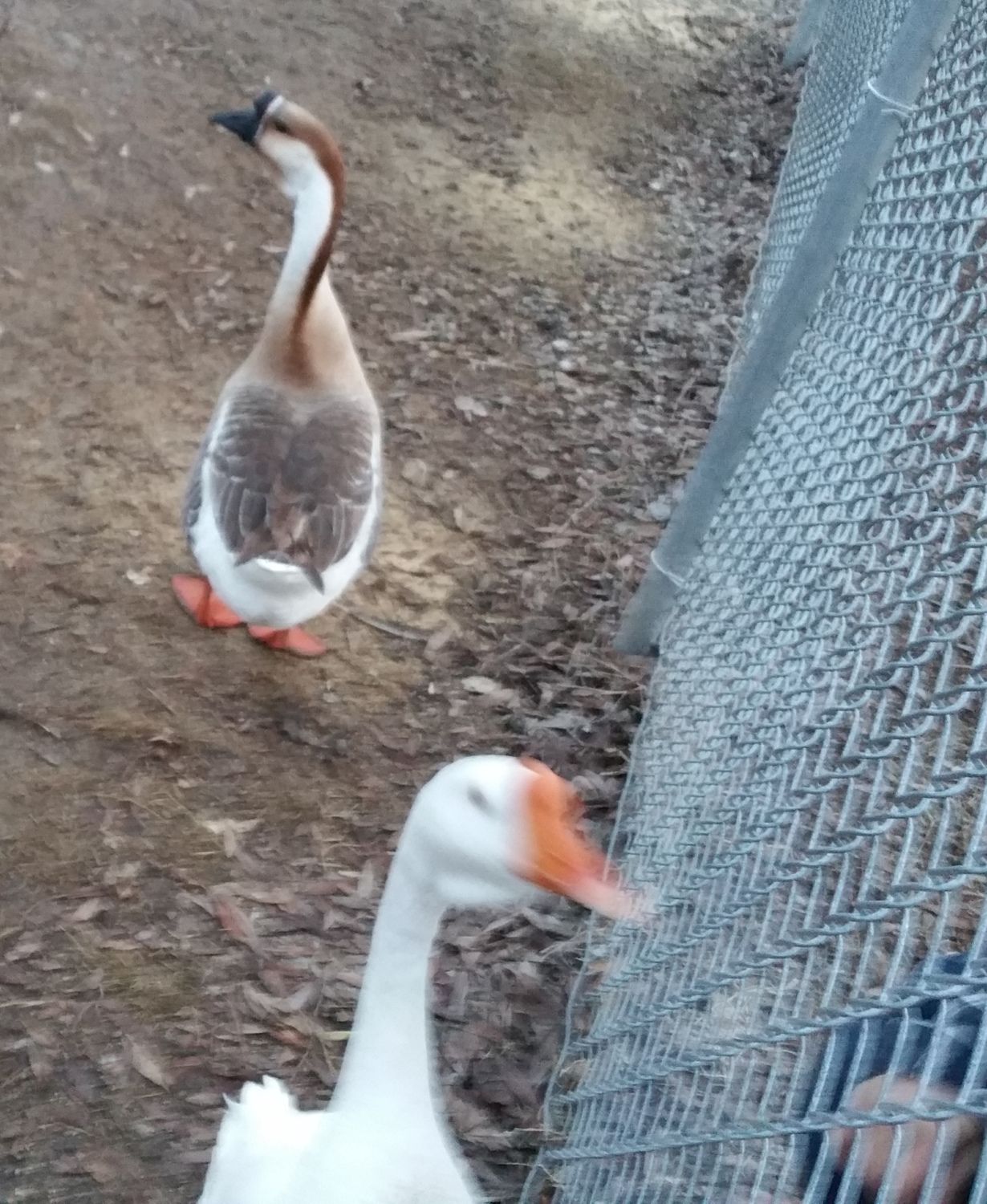 It's so sweet of you both to take an interest in these birds and so sweet he want's to interact with y'all. Do they look in good weight? he looks a little slim. Both are so gorgeous I just can't imagine how anyone can do this just dump them off. Thank goodness there are caring people to help them out[you 2] hopefully they will start eating soon. Have you tried mixing scratch or whole corn in with the All flock? even a small amount might get them started eating.Yesterday, Yvonne and I went back to the fairgrounds fairly late just to check in on our friends. The same goose and his GF (I think she's an African) swam across the pond and came over to visit us. When we first saw them, they were on the farthest side of the pond, so they really didn't have to come see us. They swam across as a couple and then climbed up the embankment and over to the fence. He came right up against the fence again and she hung back about 10 ft or so for the most part. He engaged us both and actually seemed to track me a little more this visit. We both scratched his chest and he seemed to like it, he still didn't want any food so I don't know if that is he doesn't like all-flock, he wasn't hungry or he is hunger striking??? We could easily identify his girlfriend because she has a scabby looking growth on her knob (like it was injured a long time ago, and has long since healed - I think it is more scar tissue than scab.) In my first post, you can see it barely on the right-most picture.