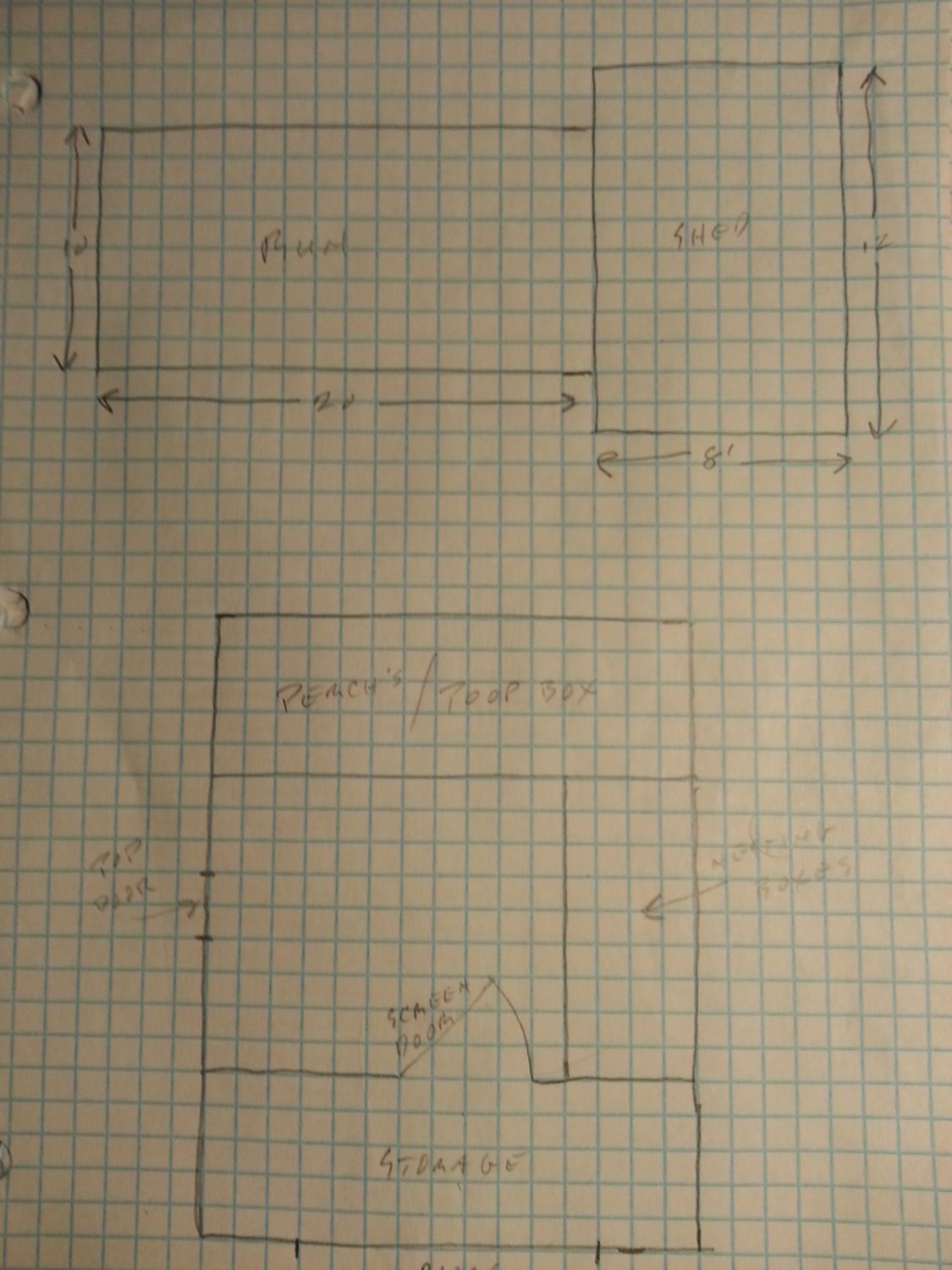 The top drawing is what I plan on doing. I have purchased another panel for the dog lot, which will be opened up and butted up against the shed. The current run is not attached. The bottom drawing is the plans for the inside of the new coop. A ramp will be in front of the nesting boxes that will lead up to the poop box, perch's and boxes.