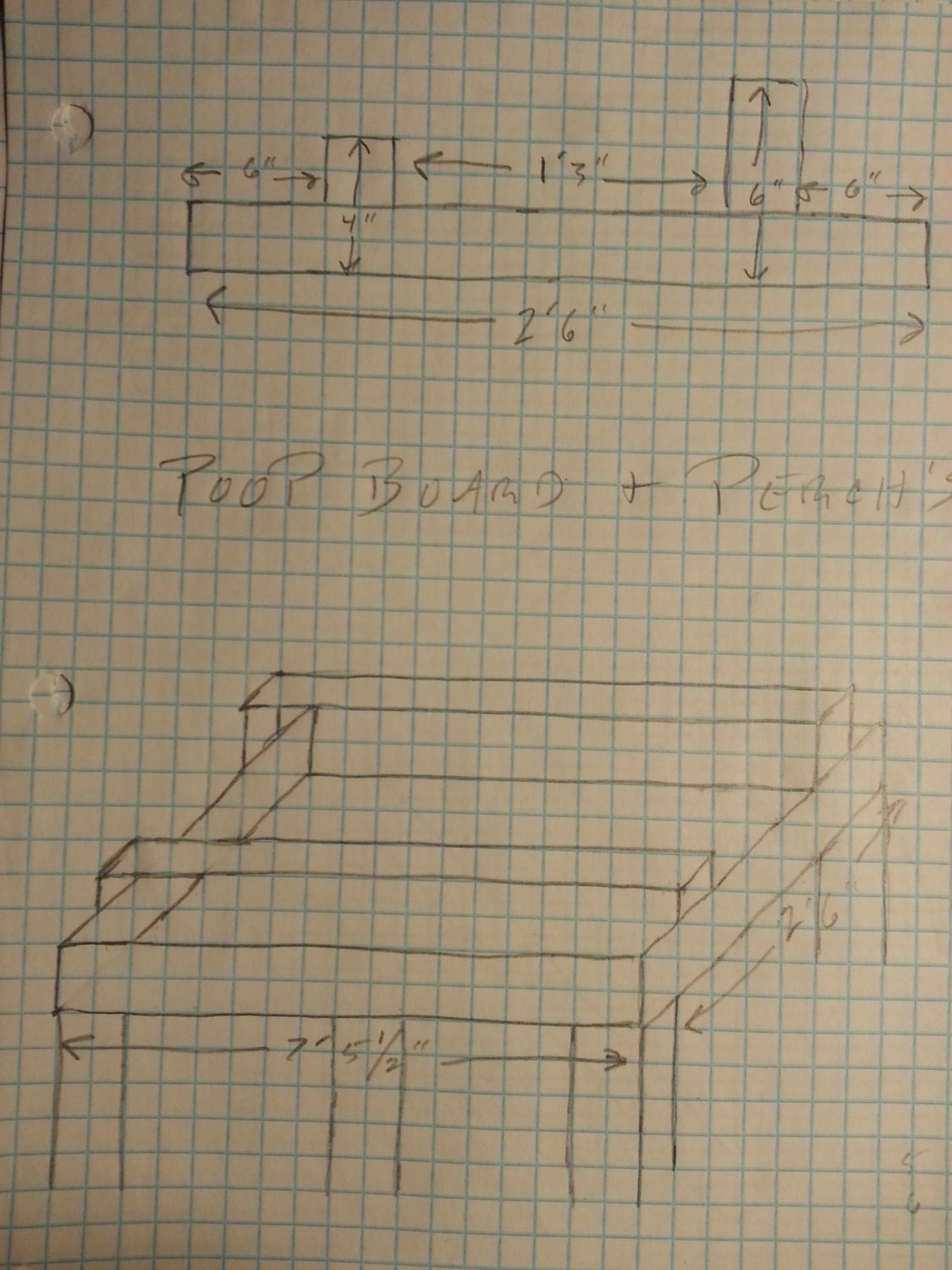 Drawing of the poop board and perch's. You are probable thinking, that is one big poop board, but I have Rhode Island Reds and plan on adding more. I am looking at having 16 total birds before I will have to go to a bigger space, but 16 is enough for my wife and I.