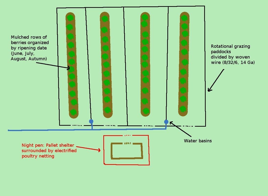 I'm new to keeping Geese but have fast fallen in love with them and hope to have them do a big job on my farm: keeping the grass down in between rows of berries, which I have a lot of. I'm hoping some more experienced geese keepers can tell me whether or not my planned setup will work well or if there are design flaws. Any advice or help would be appreciated!