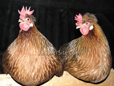 I don't think leghorns would have the "top hat" feathering...Brown Leghorn hens? I'm not really sure.......![]()