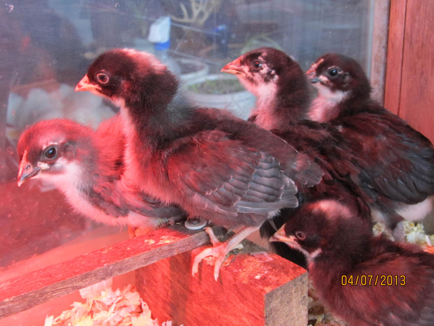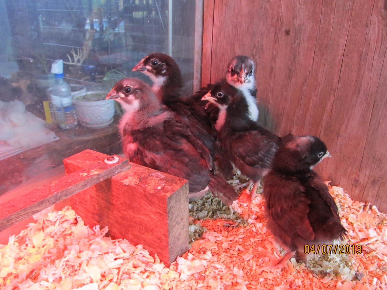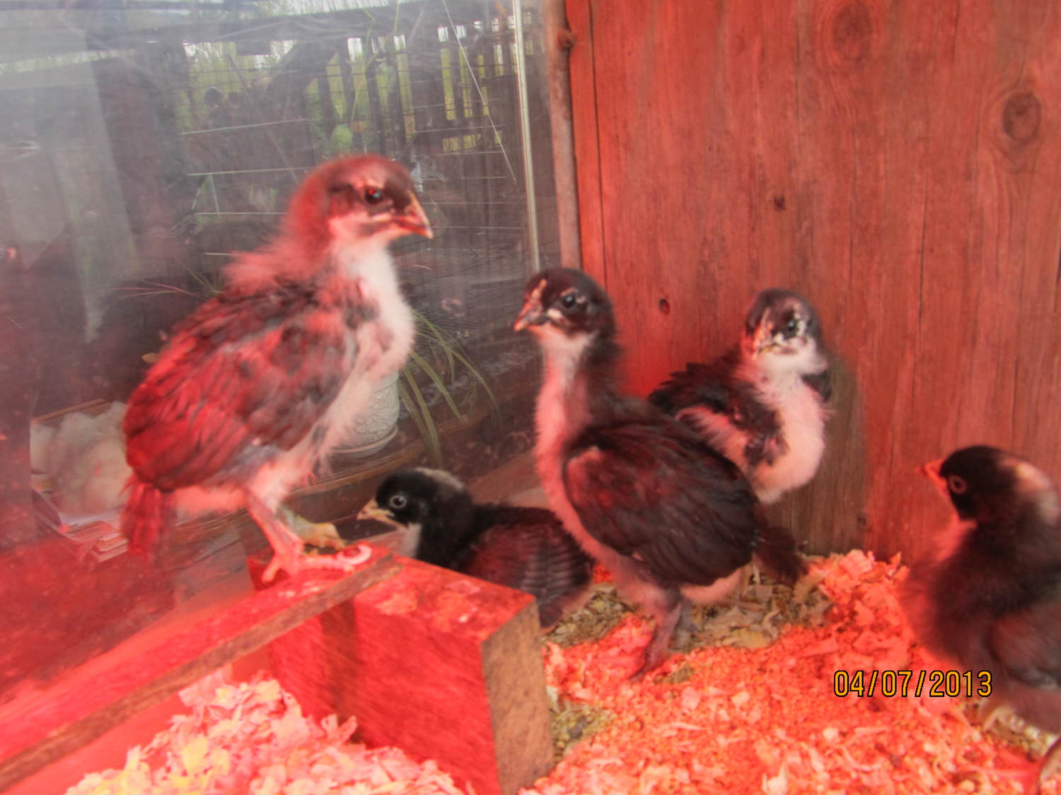 They are about 2 weeks ( the larger 3 ) .... I cant tell if they are Roo's or Pullets ! I *think * there is 1 of each , and 1 unknown yet .... I have to rehome them if there are Roo's ( they were straight run ) .... so today I went and got 2 Cuckoo Marans ( the smaller ones ) that they said were pullets ...
