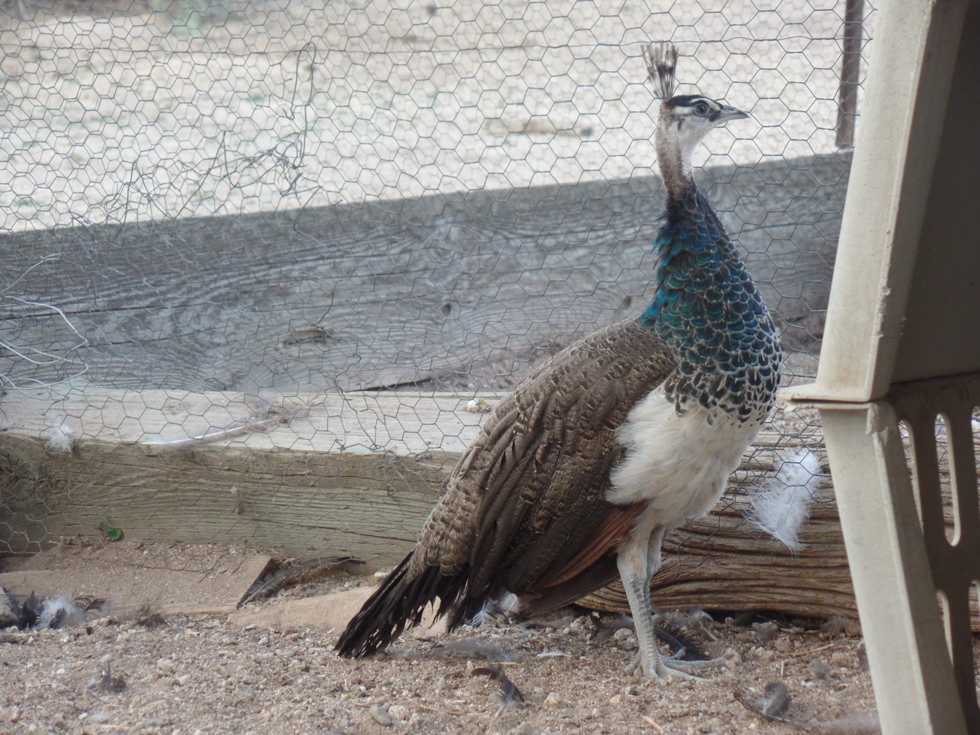 Here's an update on my peachicks. The brown one has green feathers coming in on his neck.
