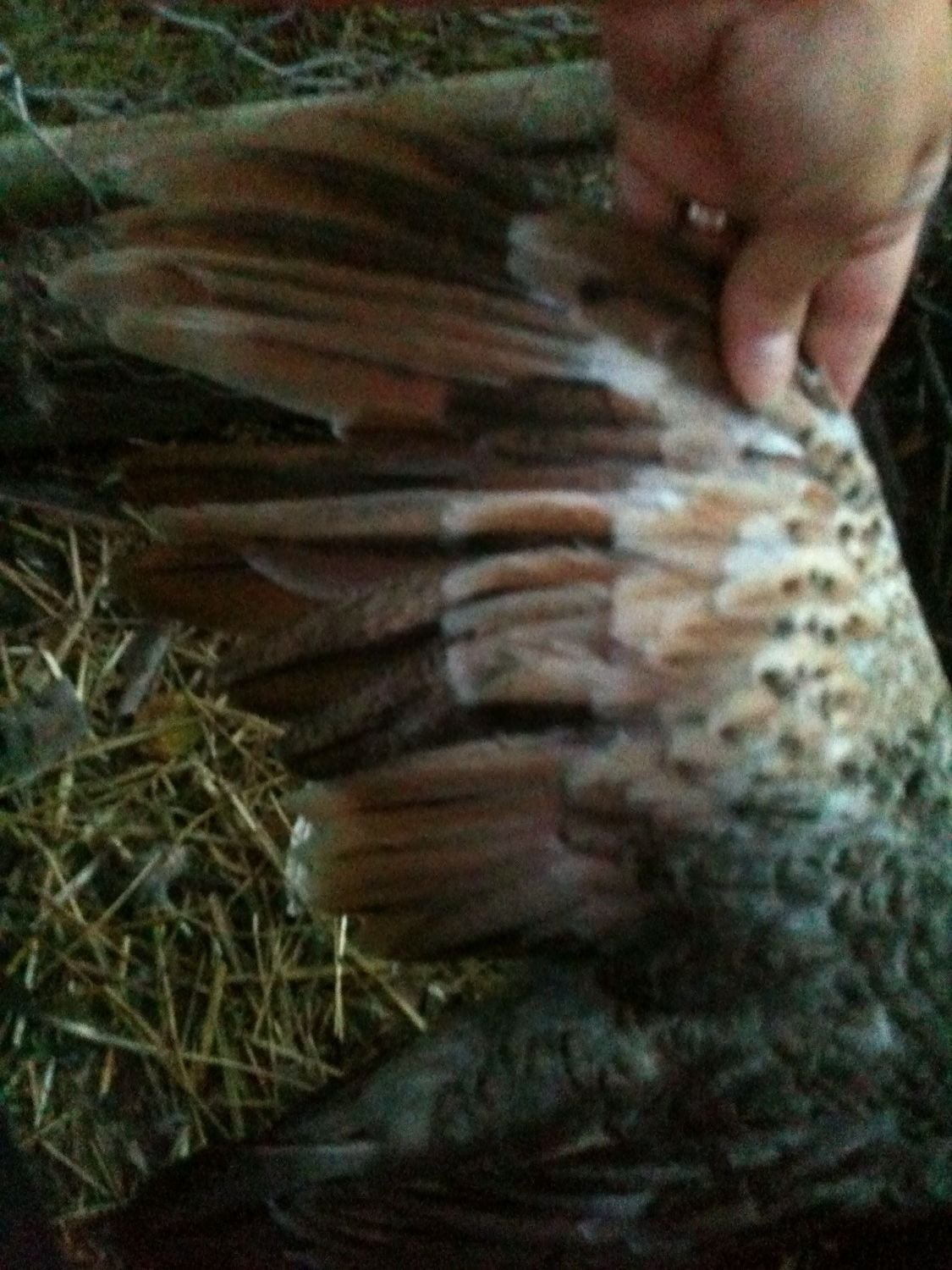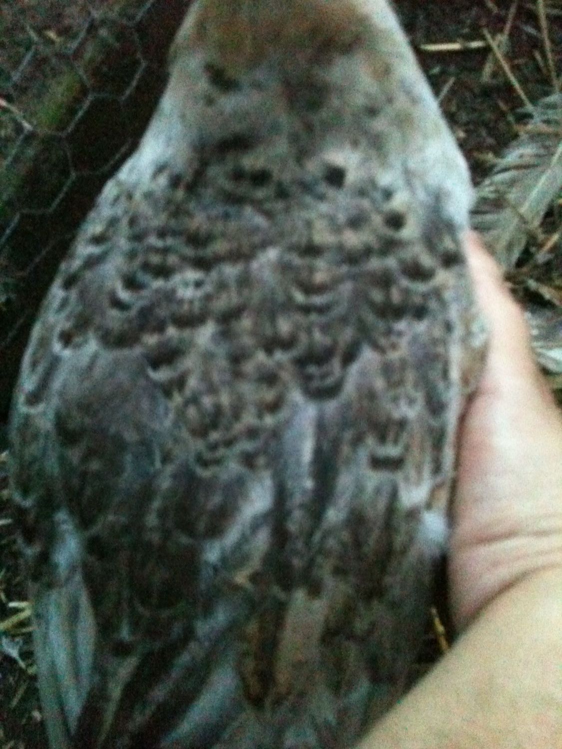 What Dylansmom means by fish scale is something like this. Don't pay attention to the chick look at the mom in the back. See how the neck feathers are wide not long? That's what she means by fish scale also the neck feathers on hens look like a scale pattern while males at a young age have long narrow neck feathers but when older it looks similar to blue skin. Usually orange stays with male unless it's BS hen they have orange primaries with black near the shaft of the feather; and Spalding hens can too. Spalding hens can have barring, orange primaries, and color on the head. They tend to be darker though than an IB hen.So birdrain your 10 week old male in the first picture has that fish scale look to his neck. Mine is getting that look too. So males and female both will have the scale look, but males will have blue too? And the light chick definitely has orange primary feathers. The orange is only in males then?