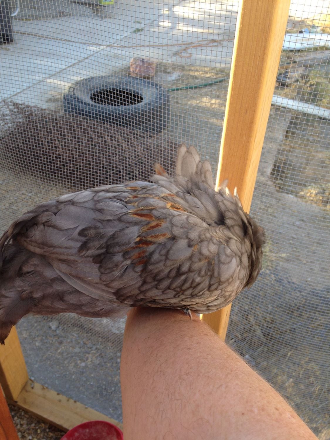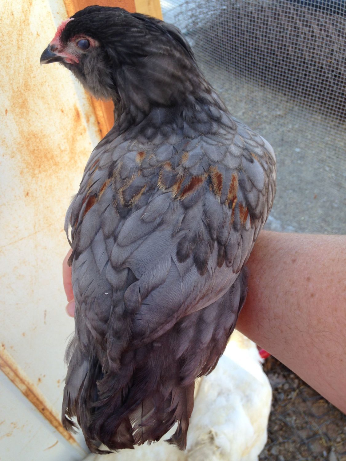 I have a challenge for you. He or she is a true blue Americauna hen x red Easter egger roo cross. This chick is atleast 8 weeks old. It has a pink straight looking comb but it is not red yet. I'm guessing roo due to the hot pink color and the tiny bit of red across its back, but because of how pretty it is, I am waiting to hear a crow or see an egg laid. I don't have any body pictures yet. Nothing in the body is bigger or longer than its siblings. What do you guys think?