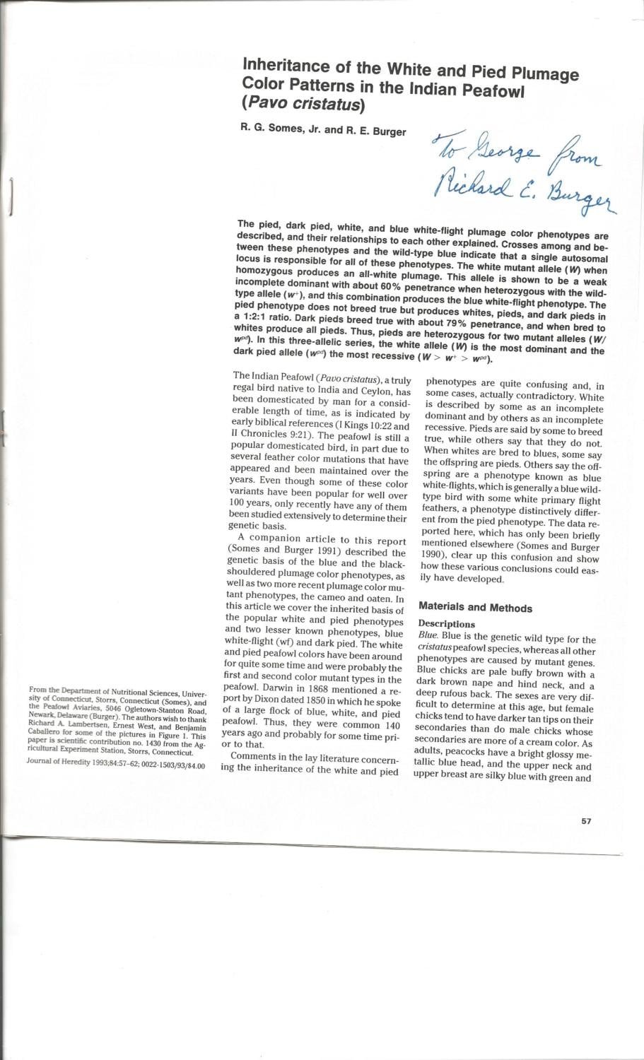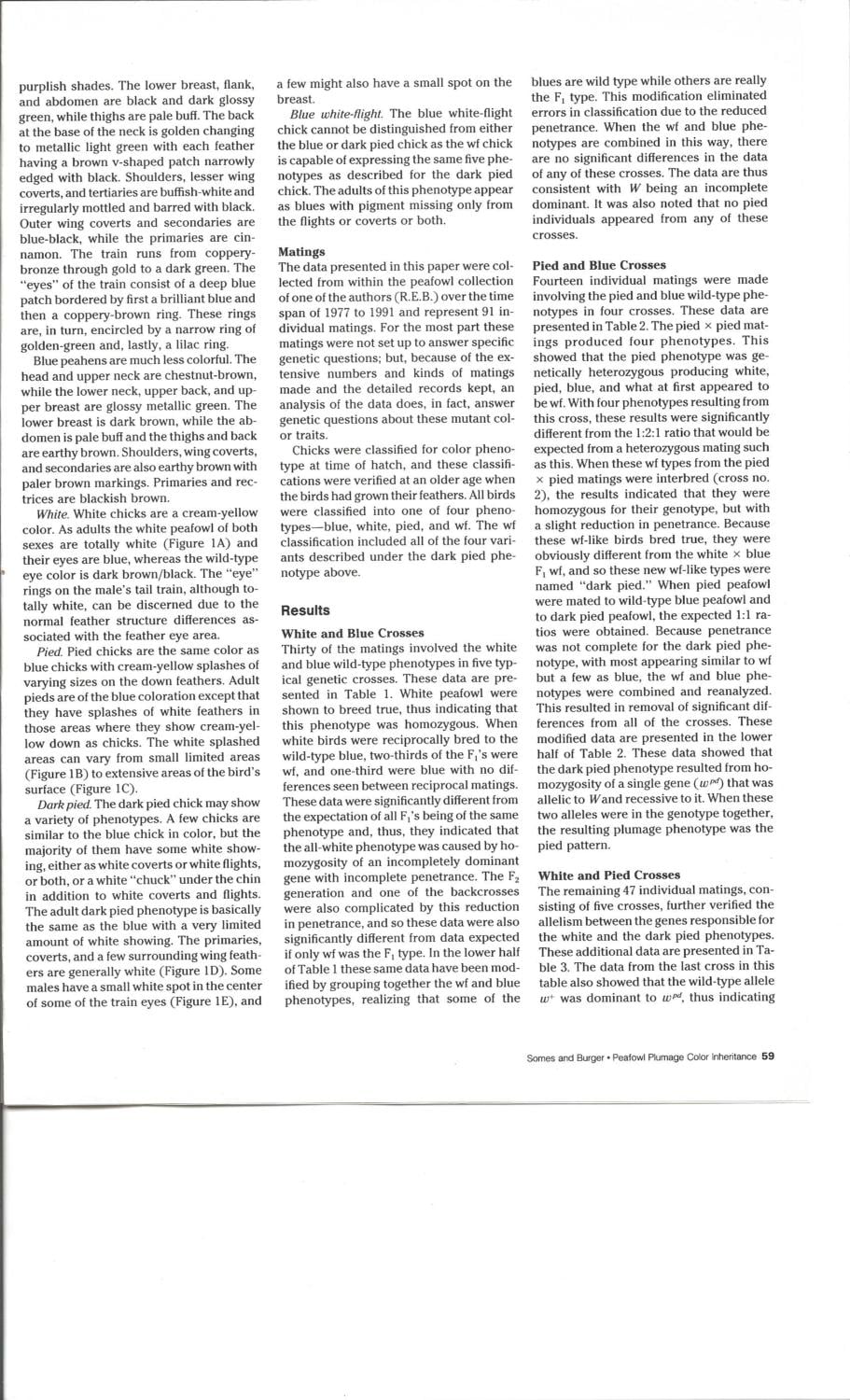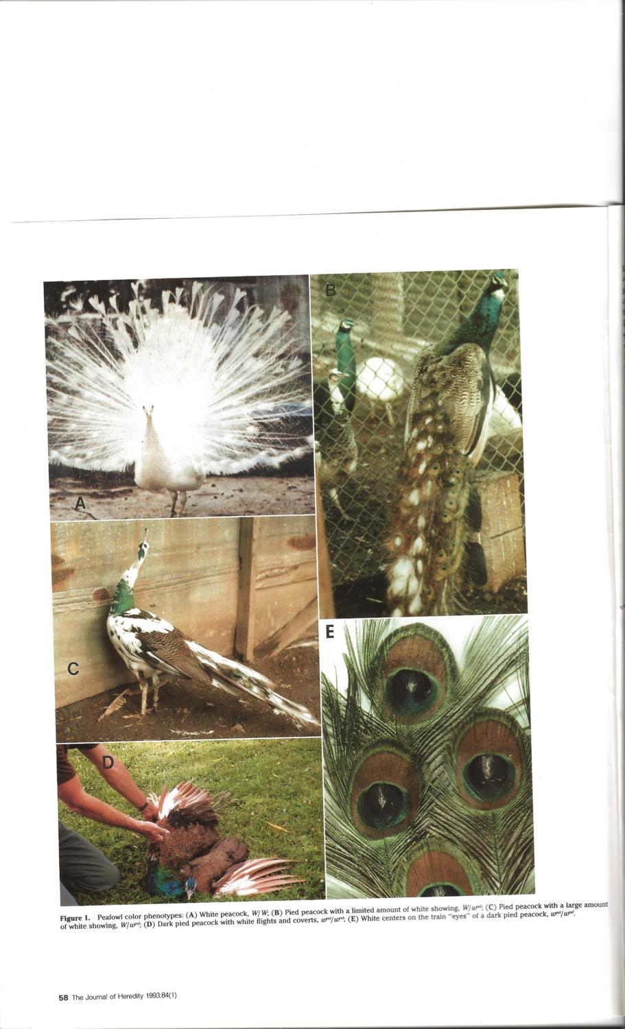Thanks to all who helped me with my problem . The first post on this thread. Are copies of research done by a friend of mine and others. I met Richard Burger at a UPA convention about 8-10 yrs ago . Richard was a pigeon breeder "Deluxe " and as you can see was good in peafowl also... He gave me these copies of his work and I also have another one on Cameo . Sorry one of them is upside down. and small. I think they can be enlarged. If there is interest I will find the other one and post it. I think these were done in 1990-91 you can see these on line if you look up,,,, The Journal Of Heredity... vol 82 number 1 ...Jan/Feb 1991 . connerhills