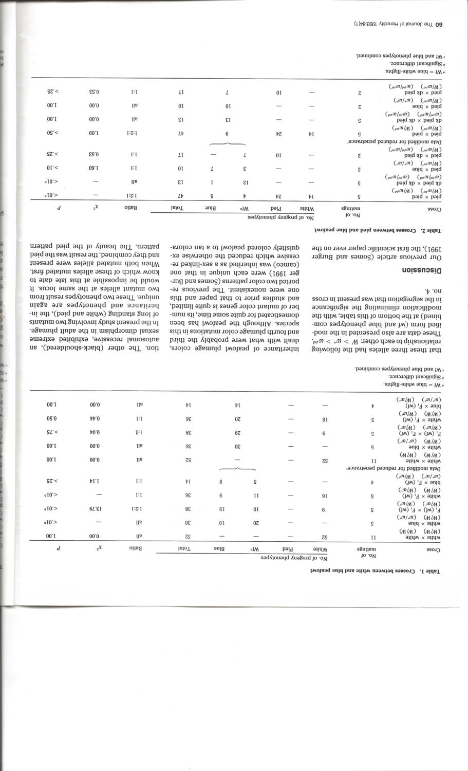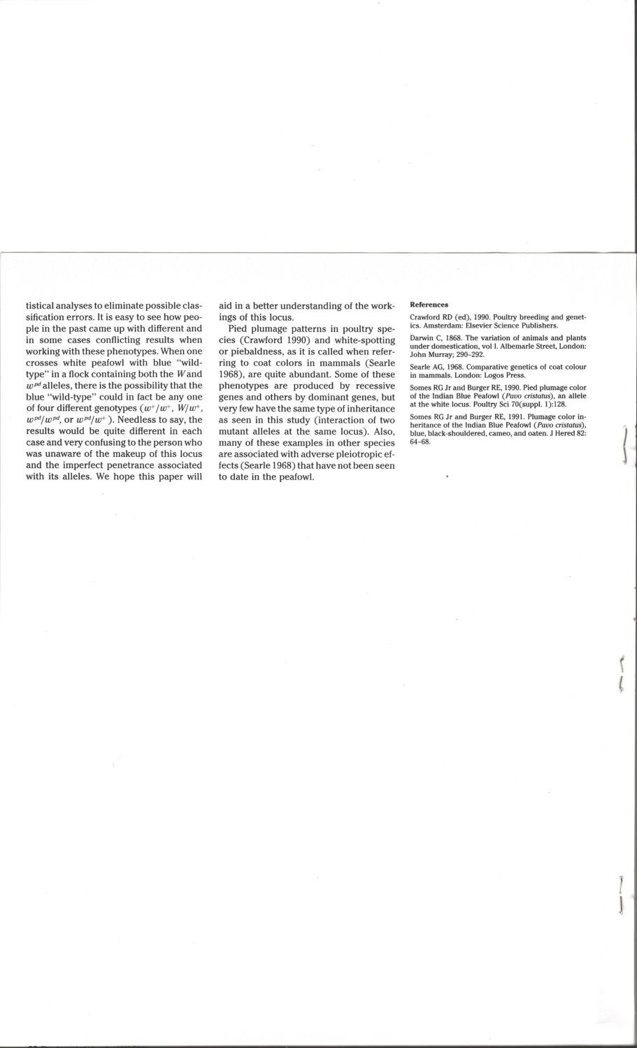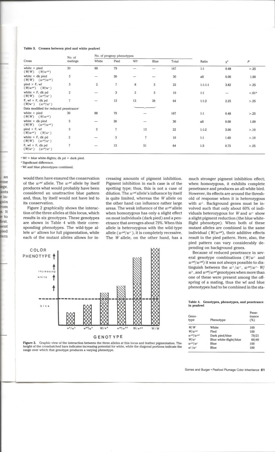 Thanks to all who helped me with my problem . The first post on this thread. Are copies of research done by a friend of mine and others. I met Richard Burger at a UPA convention about 8-10 yrs ago . Richard was a pigeon breeder "Deluxe " and as you can see was good in peafowl also... He gave me these copies of his work and I also have another one on Cameo . Sorry one of them is upside down. and small. I think they can be enlarged. If there is interest I will find the other one and post it. I think these were done in 1990-91 you can see these on line if you look up,,,, The Journal Of Heredity... vol 82 number 1 ...Jan/Feb 1991 . connerhills