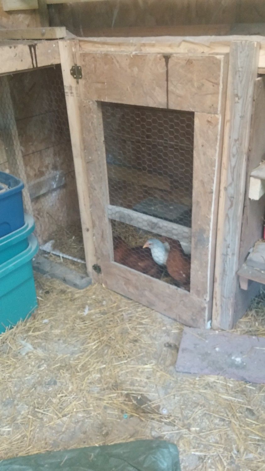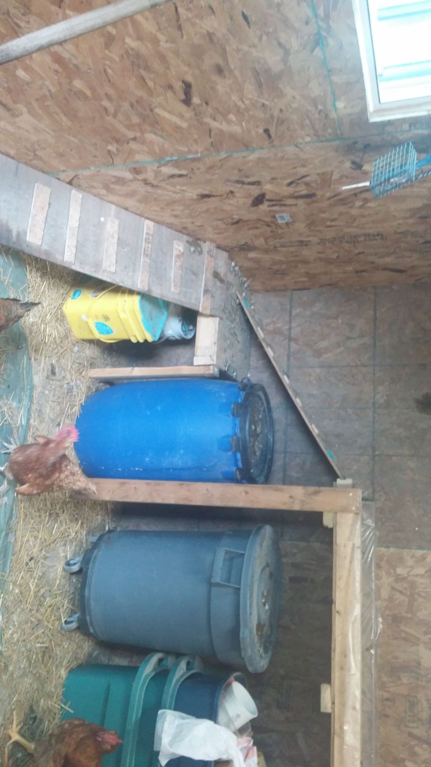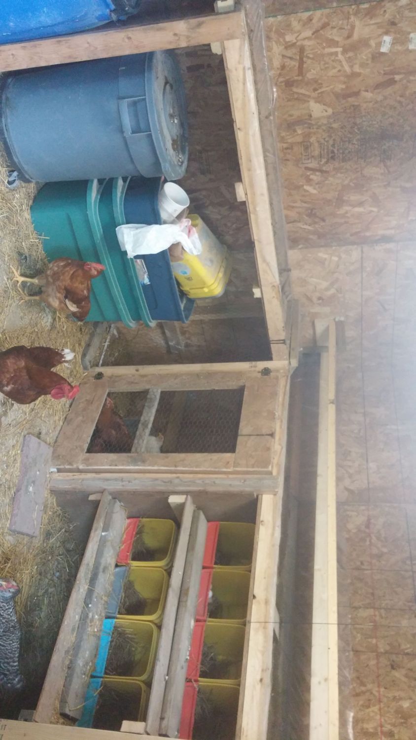 My run is around 260 square feet sandwiched in between two coops, one of which you can see in the one pic. Twelve hens live in the coop not pictured, while the four chicks share their coop with four adult hens. I have it partitioned down the middle to eliminate friction between the two age groups. I'm a big fan of partitions. The chickens enjoy the complexity, while I find it convenient to close off trouble makers on occasion.Azygous how big is your coop? we might be able to expand it where we keep the tubes and stuff but the brooder is mainly for Beebe for night for her safety.