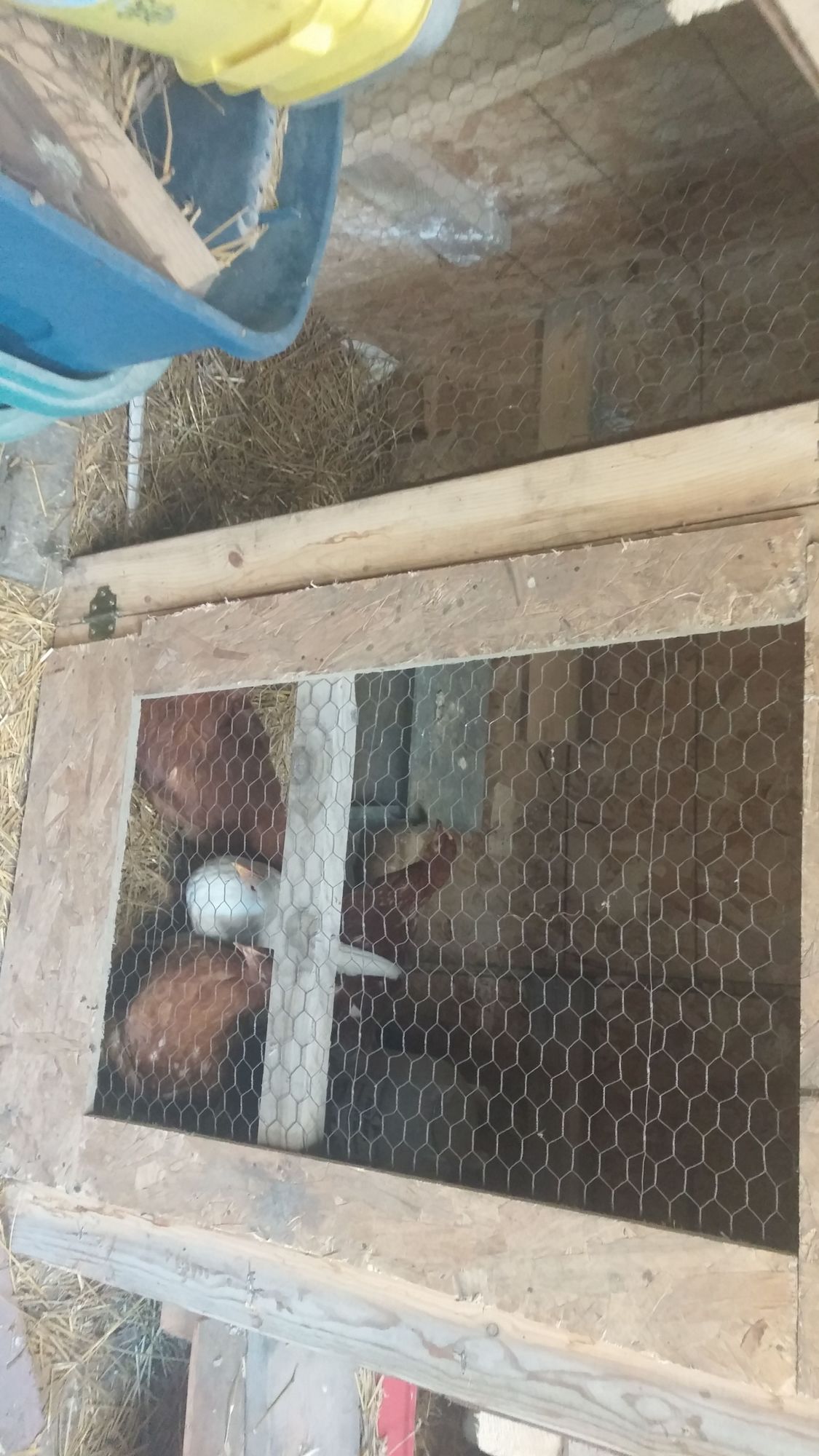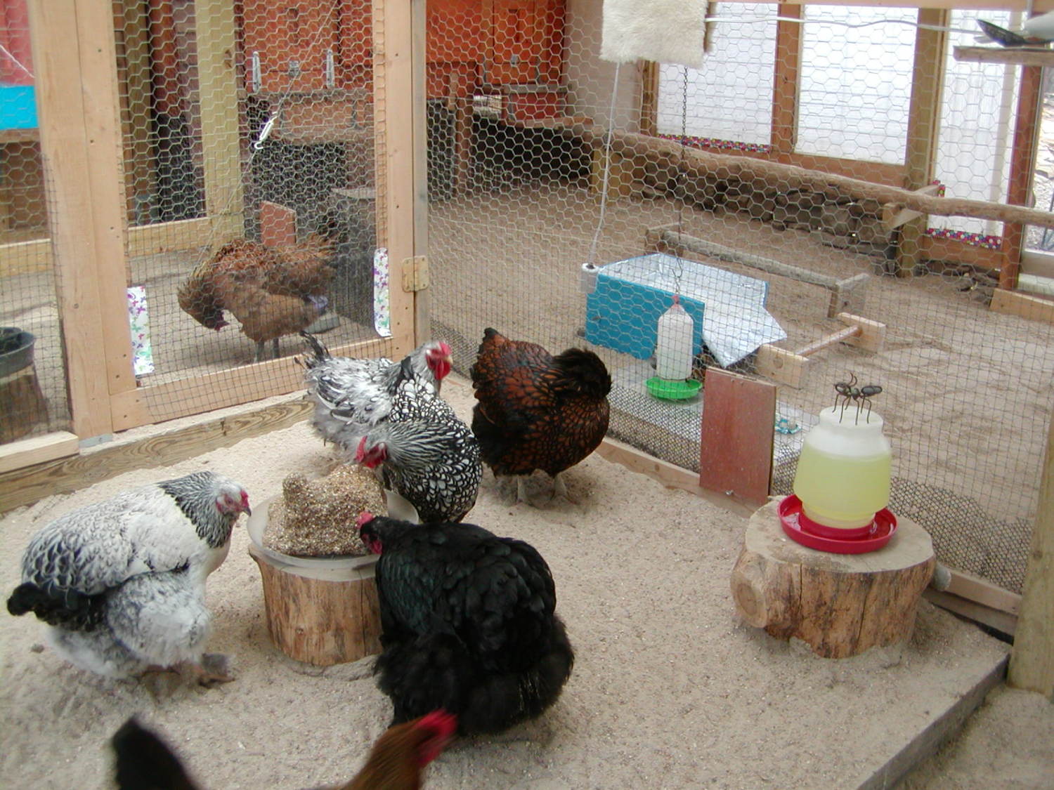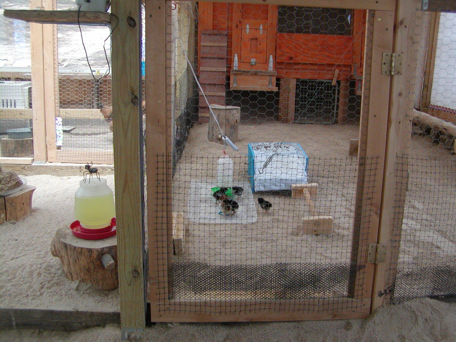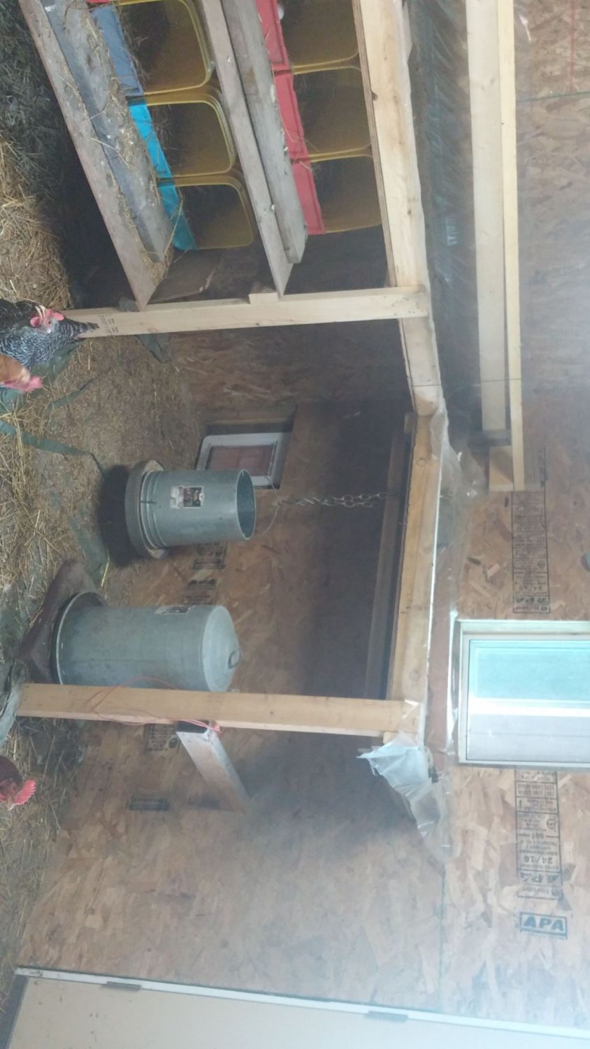 My run is around 260 square feet sandwiched in between two coops, one of which you can see in the one pic. Twelve hens live in the coop not pictured, while the four chicks share their coop with four adult hens. I have it partitioned down the middle to eliminate friction between the two age groups. I'm a big fan of partitions. The chickens enjoy the complexity, while I find it convenient to close off trouble makers on occasion.Azygous how big is your coop? we might be able to expand it where we keep the tubes and stuff but the brooder is mainly for Beebe for night for her safety.