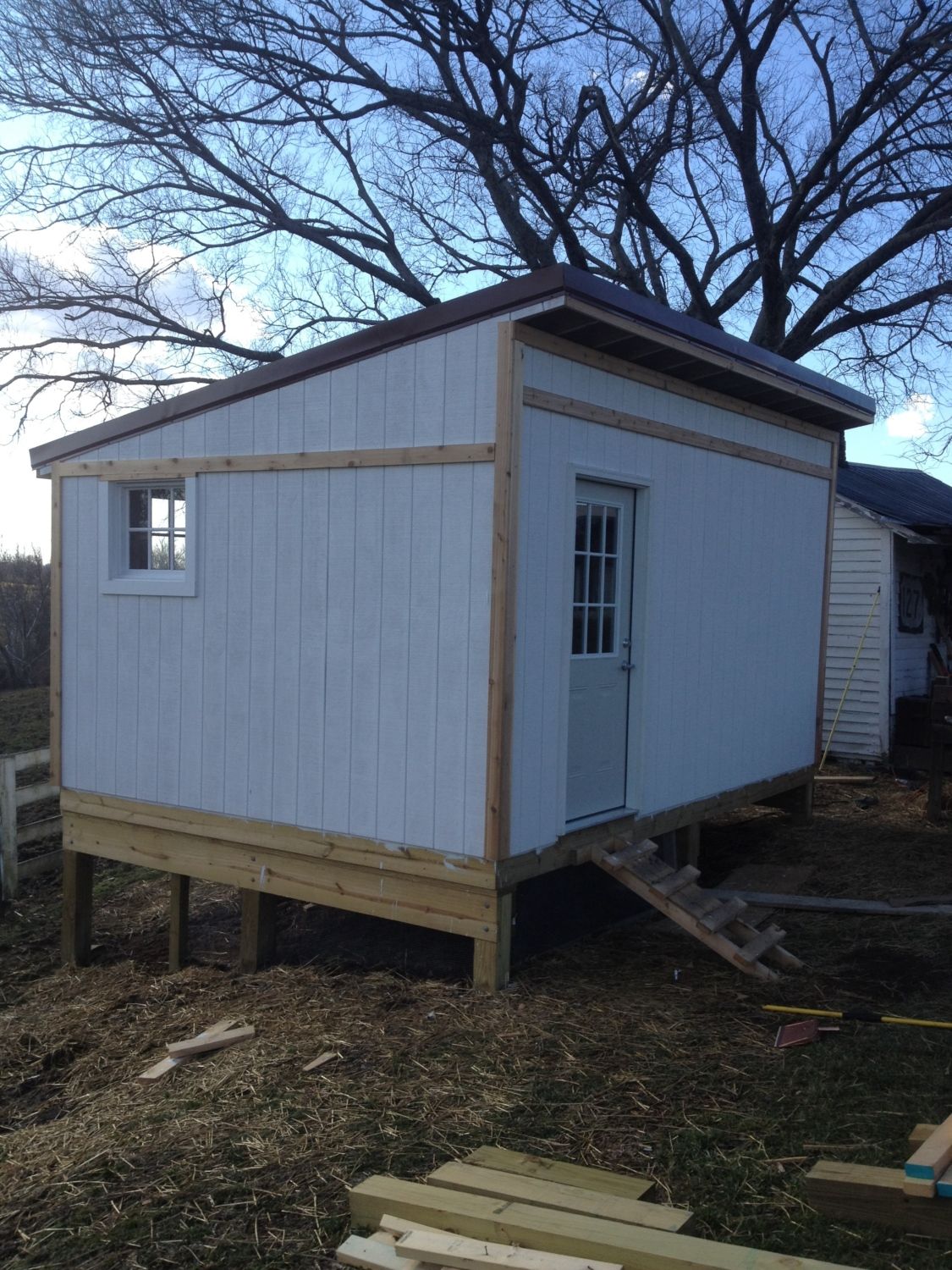 Here is the outside. Yes, I still have three windows to cut out and frame in, but I'm letting this go for a while so that I can keep the brooder box in an area without so much ventilation and keep the chicks warmer. And, as you can see, we have some of the trim to paint yet and I still have to put on permanent steps and a small front porch.