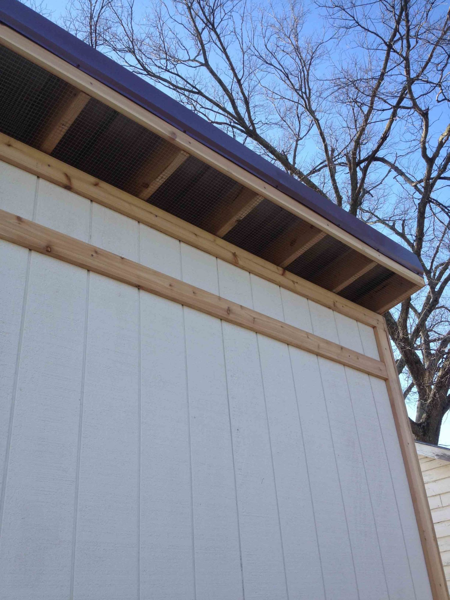 I kept the area under the roof overhang open so we could have plenty of ventilation. Of course we used 1/2 inch hardware cloth to screen out the varmints.