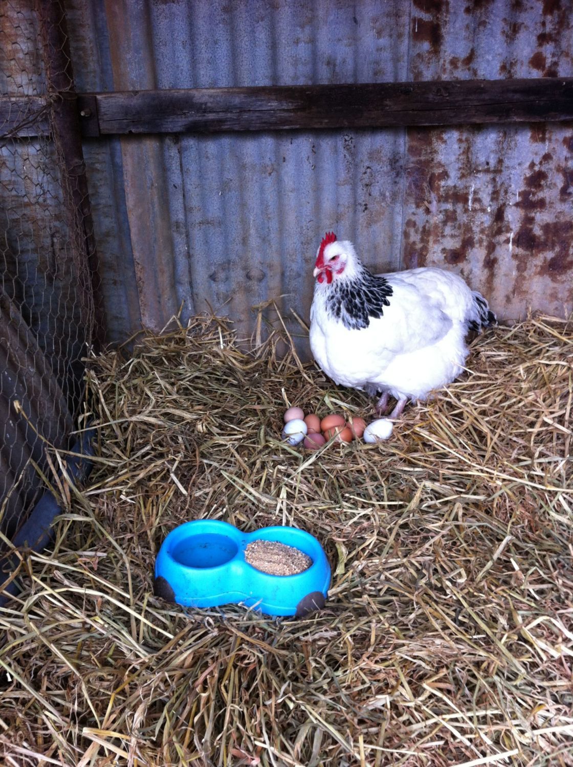 Today I put in these haybales and she went over and sat down. I put a few fertilised eggs on the hay, picked her up and put her down just behind the eggs. After about five minutes she looked down, and started pushing the eggs underneath her belly with her beak, and sat on them. I was hoping to god that she would stay like this (OMG I just made a hen go broody!!) and decided to put the blue dog bowl in front of her, and of course she got up and moved away cause I musta scared her.