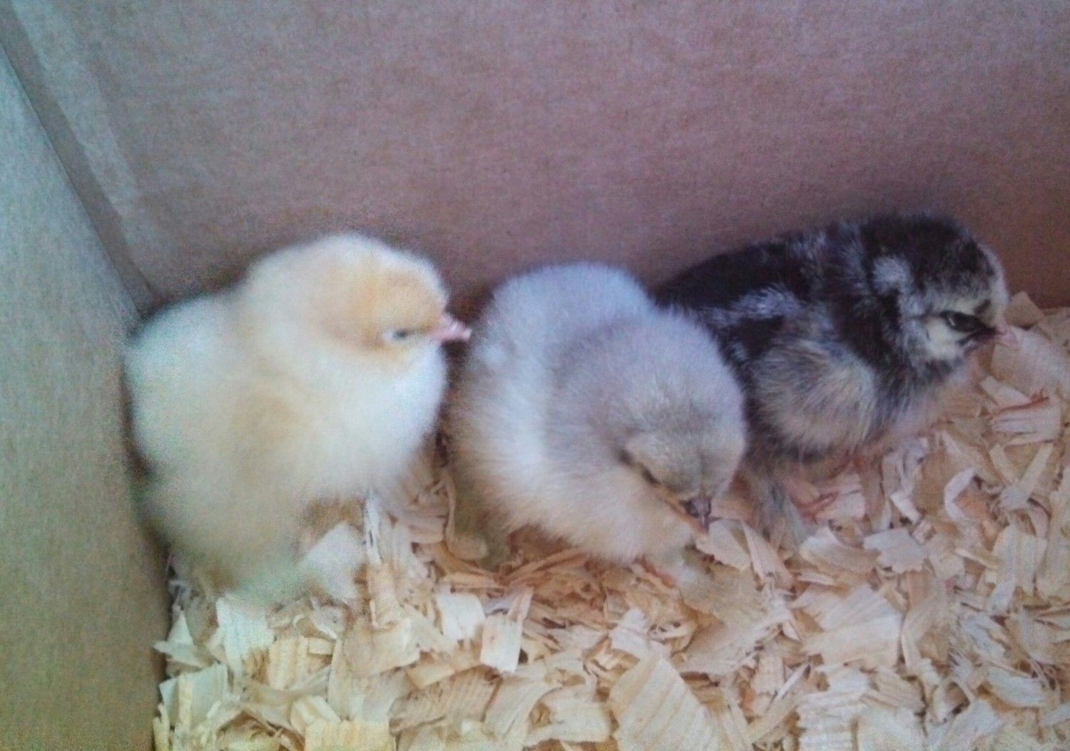 So, here are my 3 cochin chicks I got this morning - a buff, a splash, and a silver laced. I decided not to get a blue. I am planning to get 2 easter eggers in the shipment on Friday.