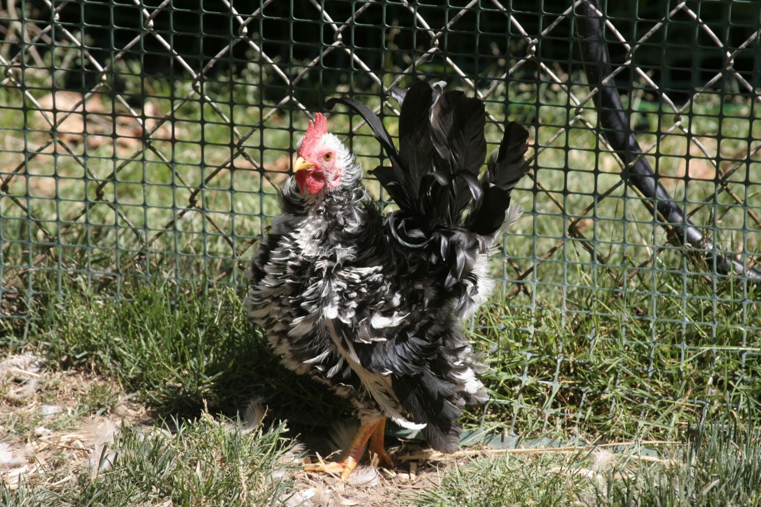 Yet another rooster needs a new home... Spot is a March 2016, black & white mottled, frizzled Serama rooster who lives on the cool(er) southern Oregon coast. He is free to a good home within driving distance from where he is now or I will meet someone half way. I can even bring him with me to Estacada (northern Oregon - outside of Portland) on August 13th if that will get him closer to a new home. Unlike those roosters who are child-proof and friendly, Spot is his own little man. He likes to strut around and impress the girls, and even defend them from the unwanted attention of a Khaki drake 3 times his size. He squawks like crazy when he is caught, but will stand peacefully enough once he knows he has been cornered. I'm not sure when he got so stubborn. His sister is happy to be cuddled and carried. He prefers to live inside and will march right in along with his sister in the evening if he can get into an open door. His sister is royally unhappy that she is not sleeping in the house but rather with him in the rabbit hutch that is situated where his crowing will disturb fewer co-inhabitants - especially my husband and my dog. It is so sad to see a 60 pound dog shake uncontrollably when she hears the crowing of an 8-inch tall rooster. (hubby doesn't shake or even wake up - he just doesn't like the high pitched crow a Serama has) If I could somehow de-crow him he might not need to leave. I was hoping to sell Spot at the fair this year after judging, but it didn't happen that way. My friend ended up with 6 left-over Serama roosters (I didn't ask her about hens) Normally it wouldn't be a problem except she is moving and can only take so many. Spot was hatched here (from eggs provided by my friend) and if needed he will live out his life here, BUT he will be much happier if he is someplace else. My choices are getting narrower about what I can do with this perky boy. He comes with a life-time guarantee. If he can't stay where he goes he can come back, but he might need to hitch hike part of the way on his return trip.