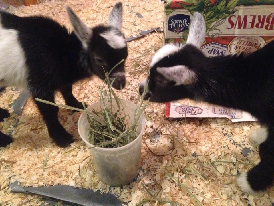 The kids are 2 weeks old today! They are doing very well. Eating well, nibbling on hay, and very playful. Since their mom decided she didn't really want to be a mom, she has been enjoying life back outside while the kids have stayed in here and taken over my entire schedule. Momma goat is eating much better now though. She has been giving us 2 and 1/2 cups of milk each day, sometimes a little more. I'm adding a handful of calf manna into her pellets and she seems to like it.