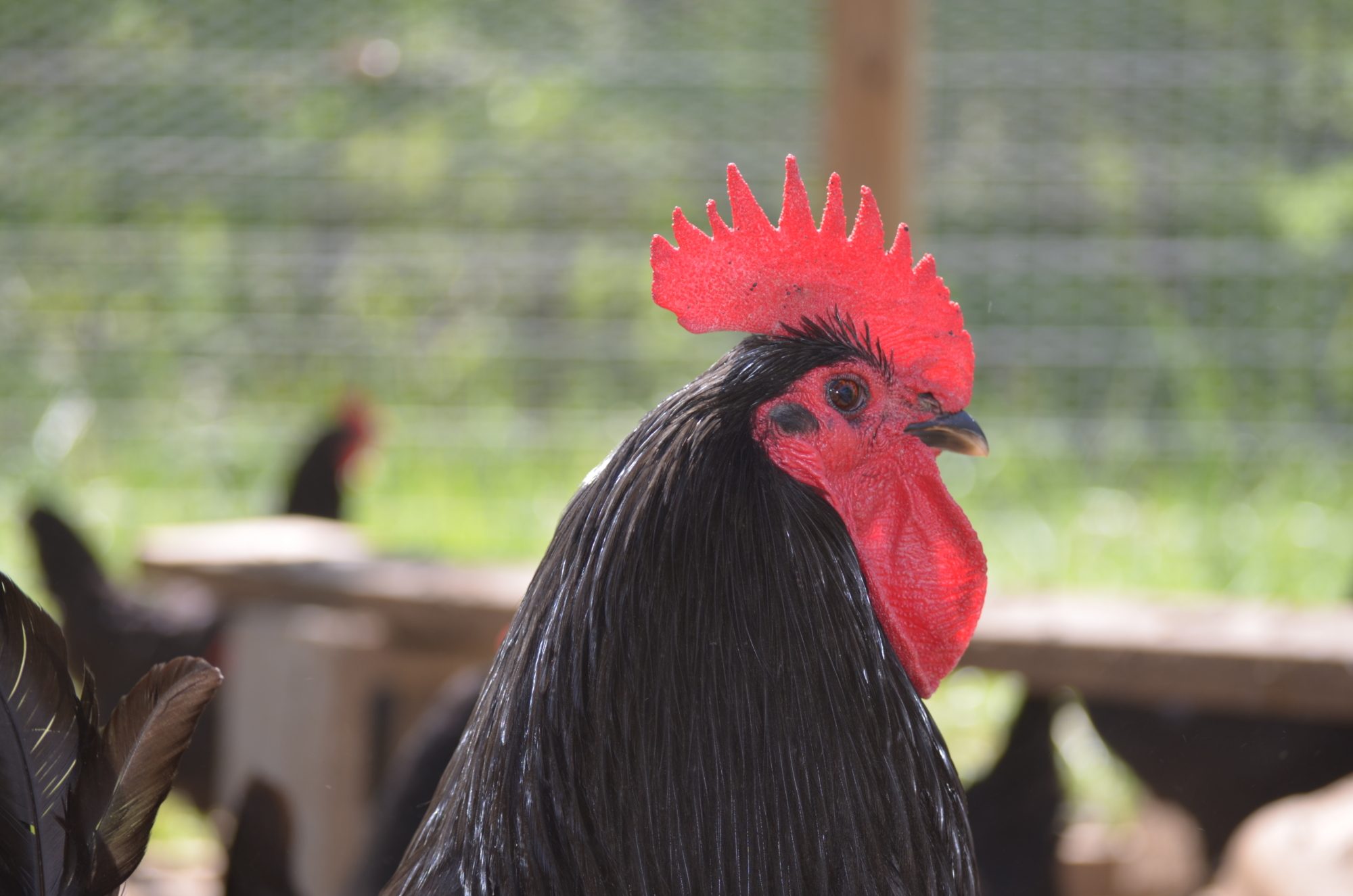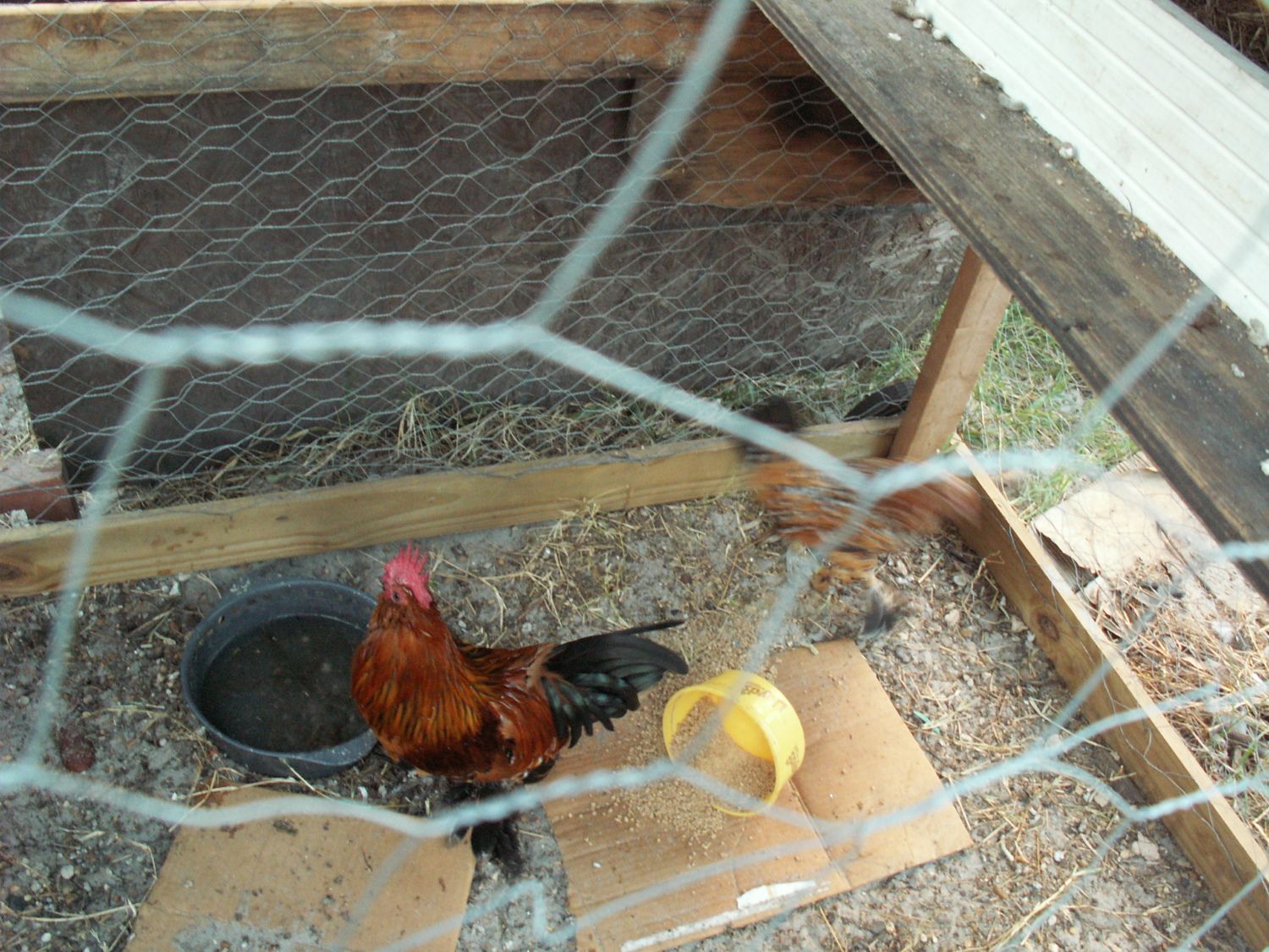 To those who ask: "whats wrong with these 2 roos legs"...Limpy got stepped on by a horse as a chick and his leg healed that way. Pharow had an accident and lost the lower portion of his leg.
